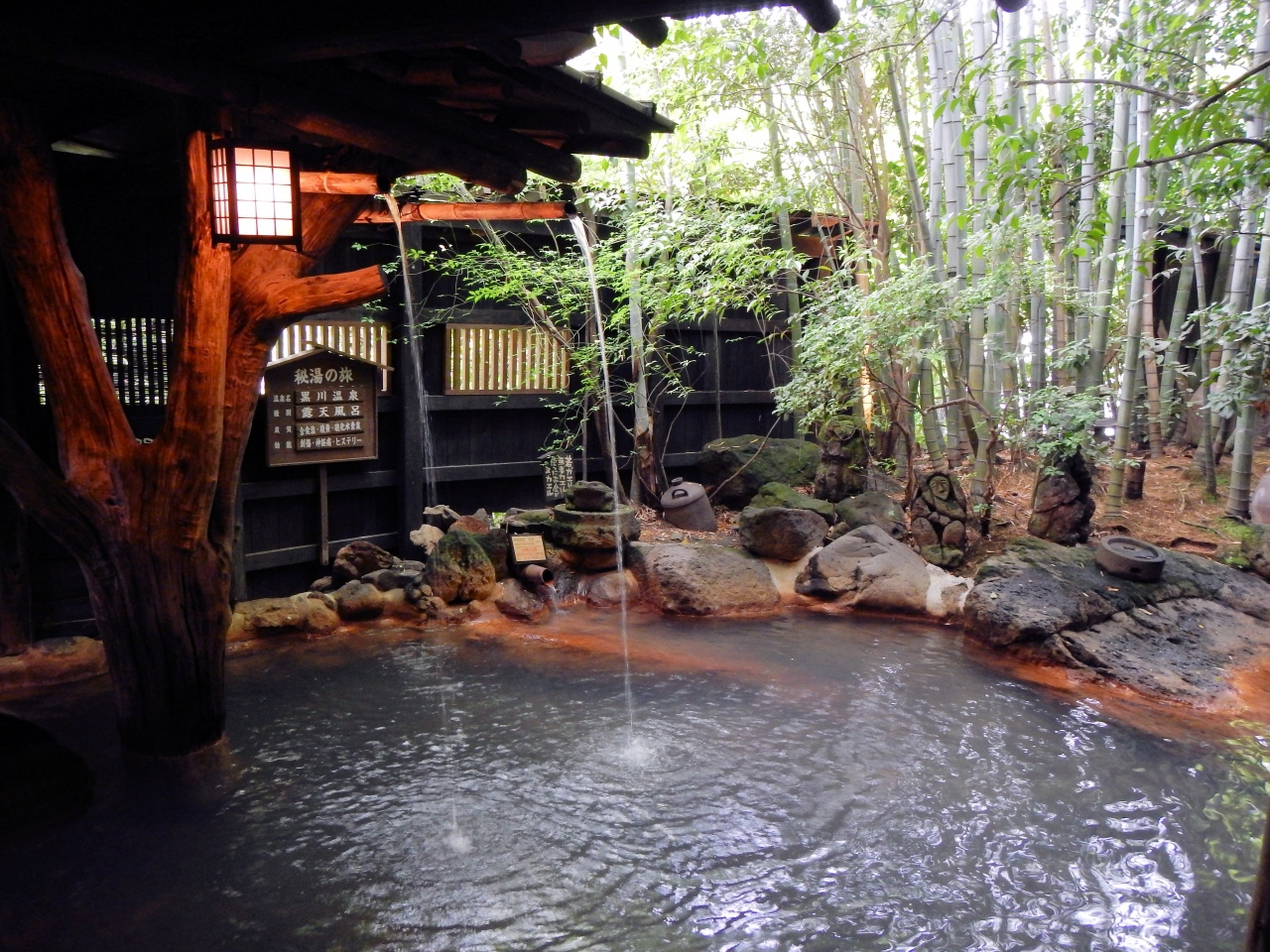 露天風呂へは橋を渡っていきます。少し青みがかったお湯です 2014年6月、入湯手形で利用しました。