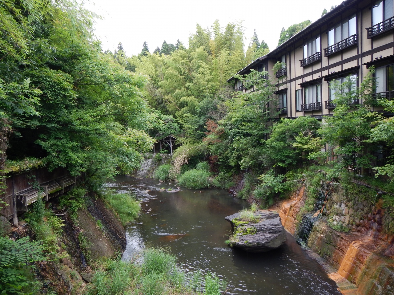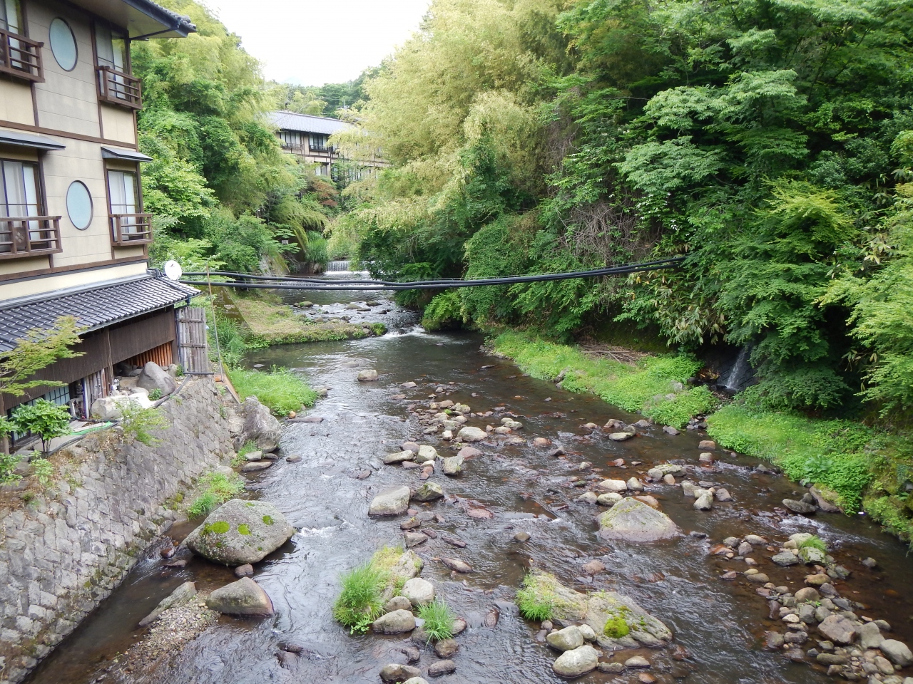 黒川温泉のメイン通りに面してあります。2014年6月、入湯手形で利用しました。川沿いの宿ですが、露天風呂はかなり高い所にありました。露天風呂へ上がっていく廊下はすごく雰囲気あります(写真)お湯は透明です。まわりに岩を積み上げた露天風呂です。