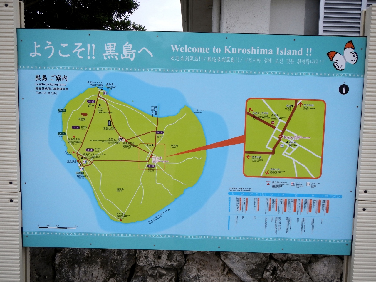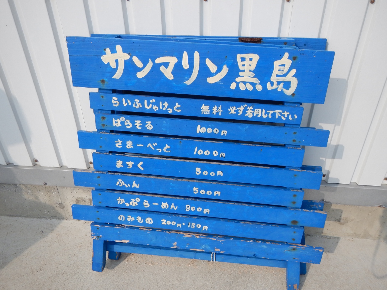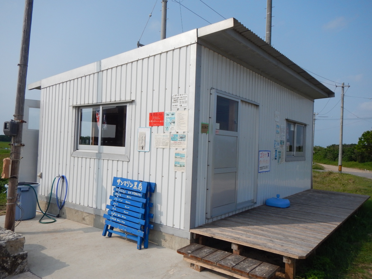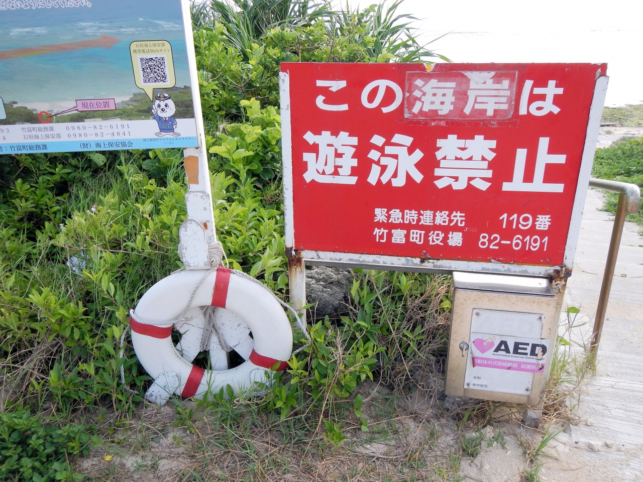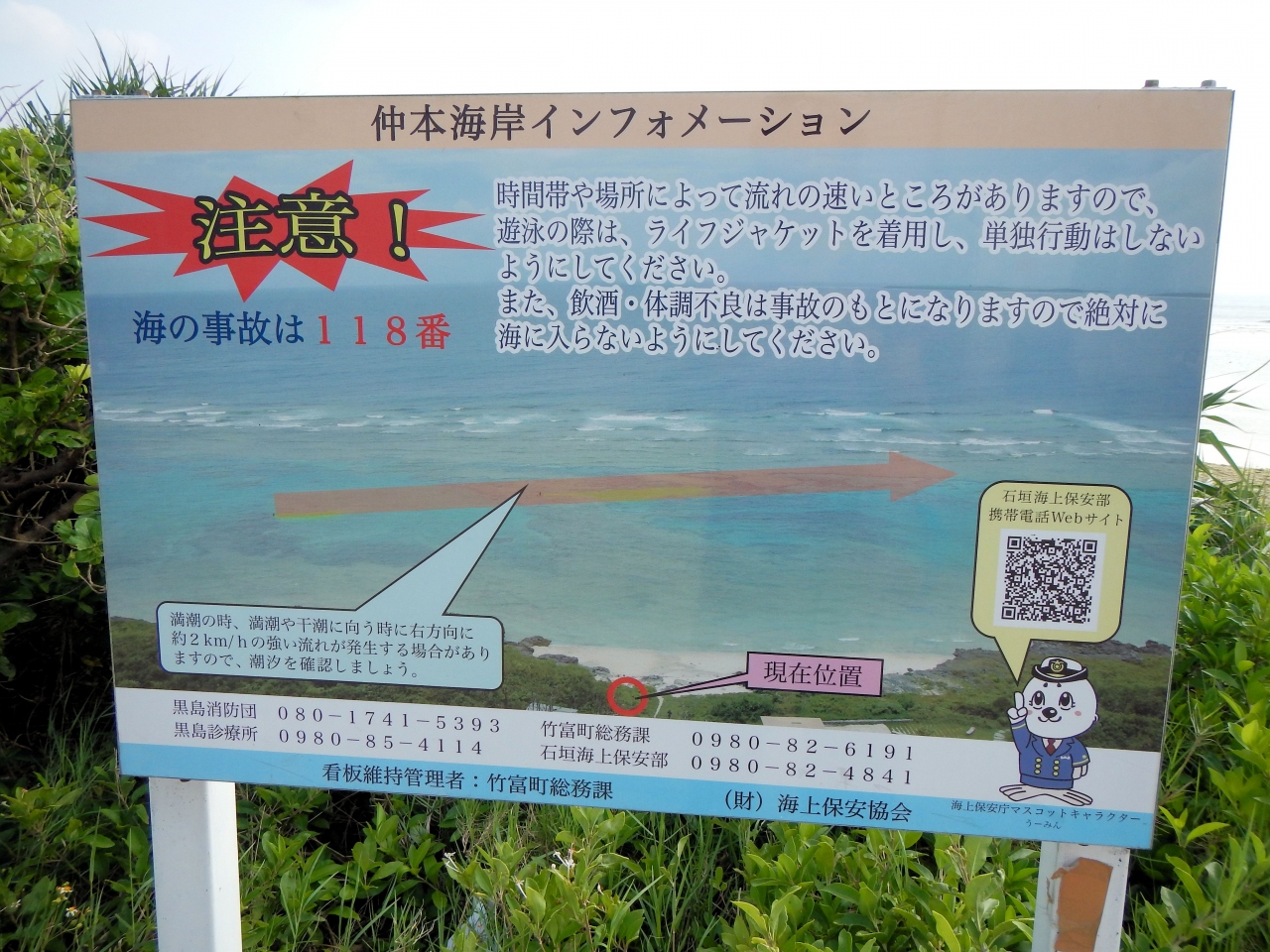 2014年5月注意書きや案内の看板がいっぱい立ってました。正面わたんじの左側はかなりサンゴが戻ってきている感じです。シーズンには、サンマリン黒島という売店が営業しています。ライフジャケットの貸し出しは無料です。天気が良いと真正面に波照間島が見えます。右手に見える2つの島はパナリ島です。