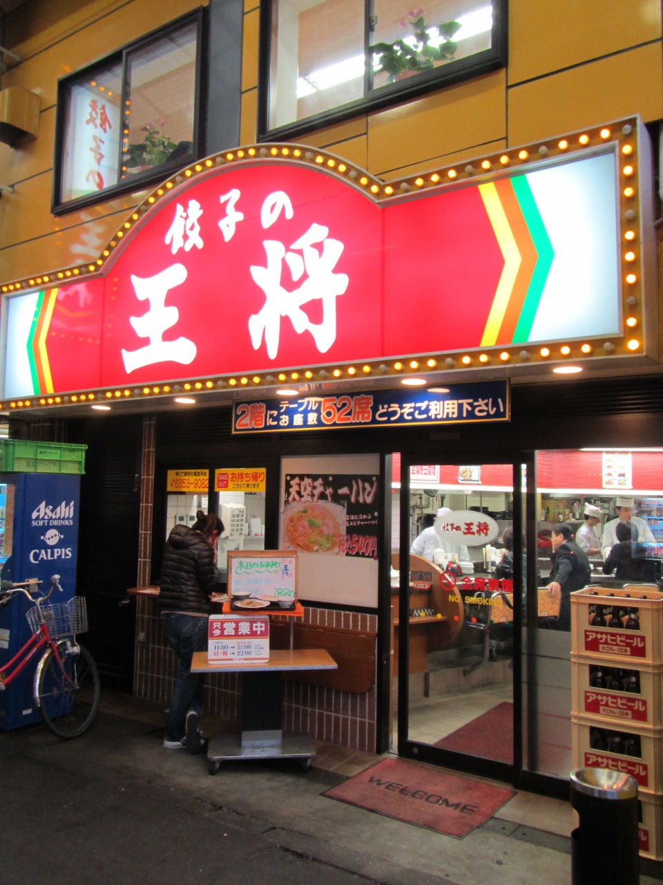 JR京橋駅の京阪側の改札を出て、徒歩1分。人通りの多い繁華街(商店街)の中にあり、いつも混んでいます。ただ、並んだことはありません。1階はカウンターです。カウンターないに店員さんは7.8人いますが、動きが止まる暇はありません。テキパキしているので、注文品は5分以内に出てきます。餃子は若干、焼きが強いです(写真参照)焼きそばの味は、王将の平均点です。