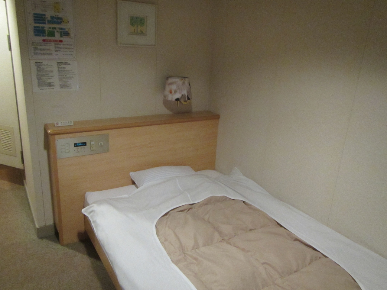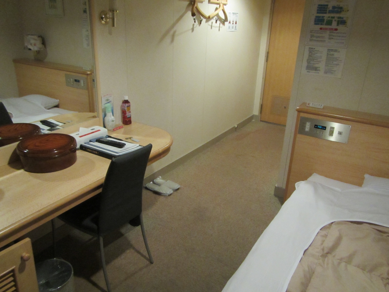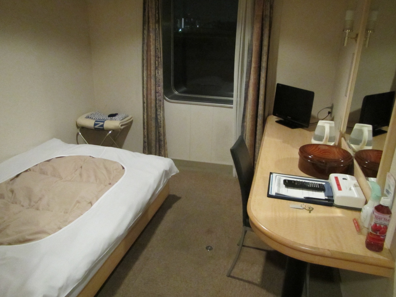 往復、最上級デラックスシングルを利用しました。値段は高いですが、超快適です。ビジネスホテルのシングルルームの倍くらいの広さがあります。結構広いバストイレ付きです。トイレはウォシュレット。他の等級ですとトイレに行くのに、外に出る必要がありますが、これはポイント高いです。テレビも問題なく各局が入りました。海側に面してますので、部屋から景色が眺められます。