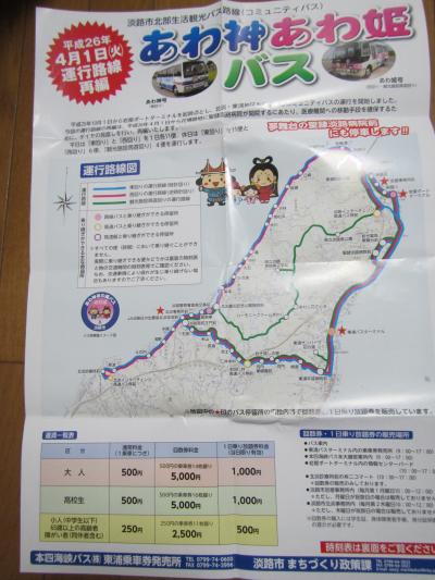 要注意!!4月1日より運航時刻が変更になってますが、ネットのリンクや観光施設の張紙は以前のままなのがかなりあり!!2014年4月1日路線再編表示を確認してください。淡路島北部の生活バスです。毎日運行の東回り・西回りと休日のみ運行している観光施設周りがあります。観光施設周りは1日4便でだいたい2時間間隔です。ちょうど、2時間観光して次に行くというパターンに便利です。まわる観光施設は、順に、県立淡路島公園→県立淡路景観園芸学校→淡路カントリーガーデン→あわじ夢さじき→震災記念公園→東浦産パーク花の湯→淡路夢舞台です。終点起点は岩屋港です。