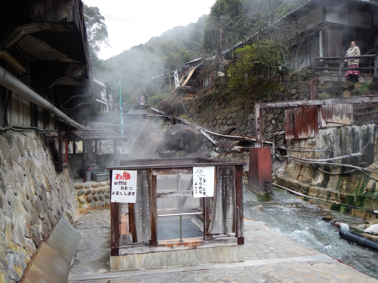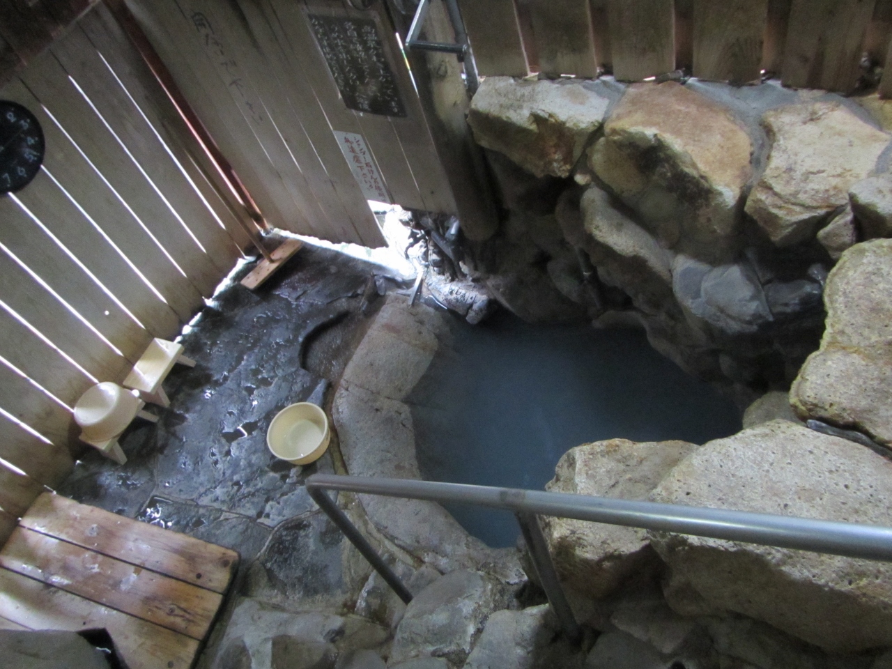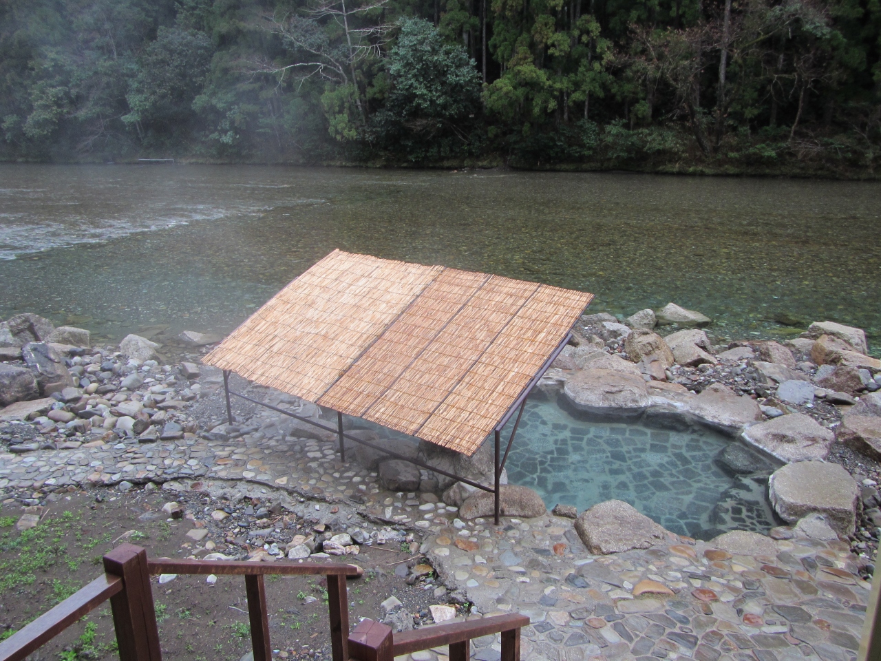 河原の木造の小屋の中が小さな温泉になっています。石鹸・シャンプー等の使用は出来ません。30分750円で1組貸し切りです。近くの湯の峰温泉公衆浴場で料金を払って、番号札をもらいます。先着順です。予約は出来ません。3月1日に来たときは待ち時間があり、入ることはできませんでした。それで次の日、3月2日の午前中に来たときは、ちょうど前の人が出たところで待ち時間無しで入ることができました。深さは80センチくらい、底は砂利で、底から温泉が湧いてくるという感じです。源泉掛け流しですが、熱くなってしまうと、当然水を足さないとは入れません。ちょっと熱かったので少し水を足しました。中に時計があり、30分たてば自主的に出て、番号札を受付に返すという仕組みです。