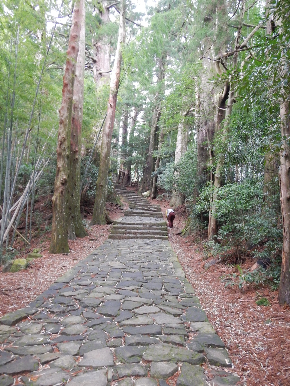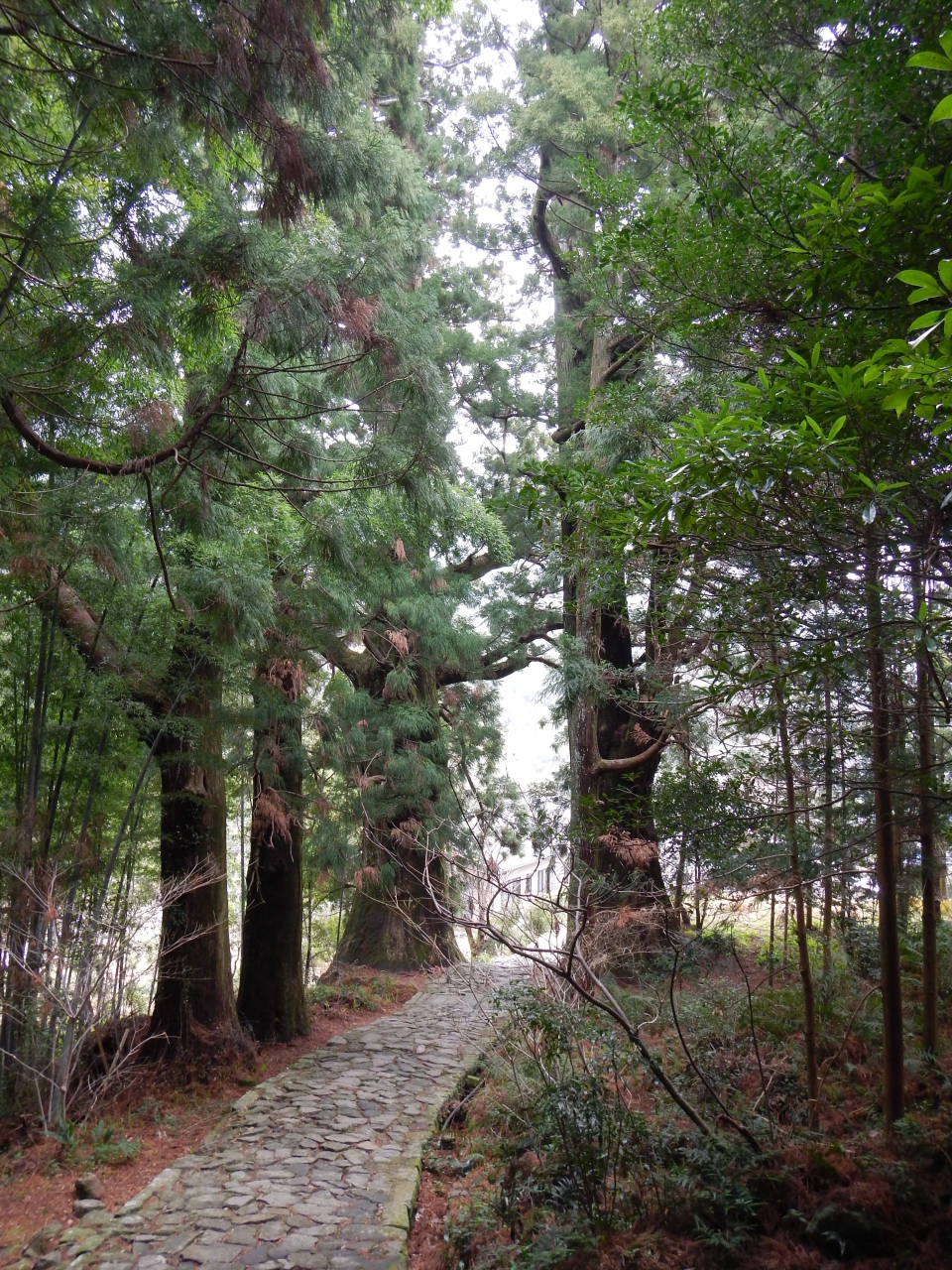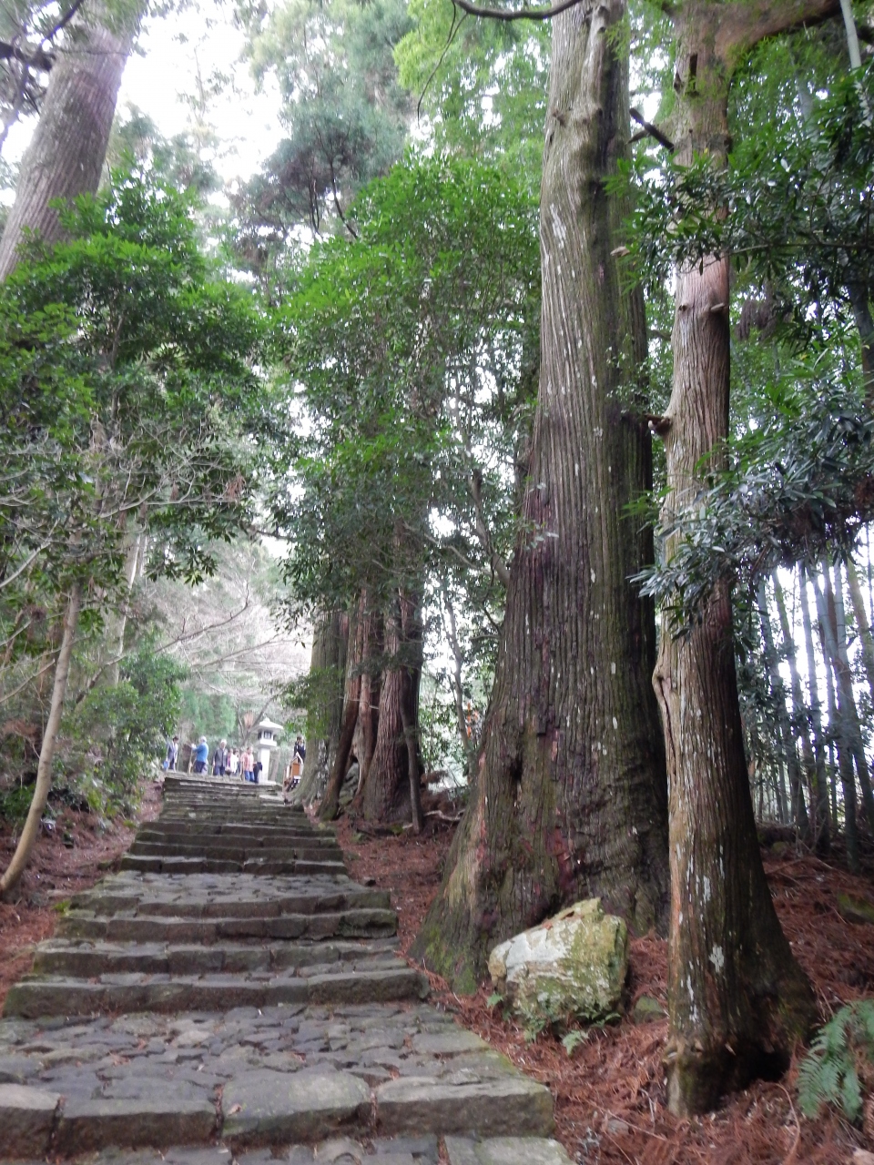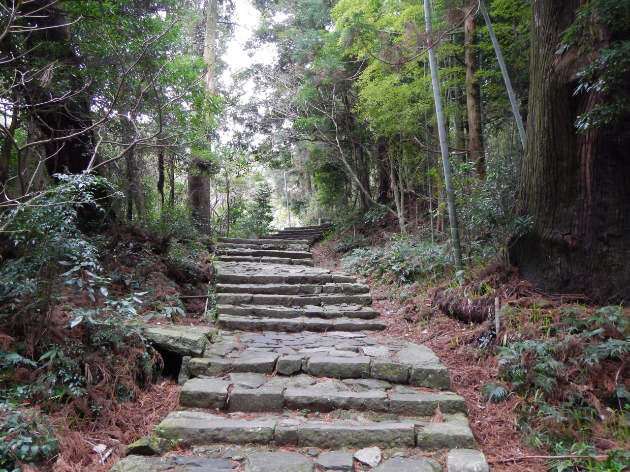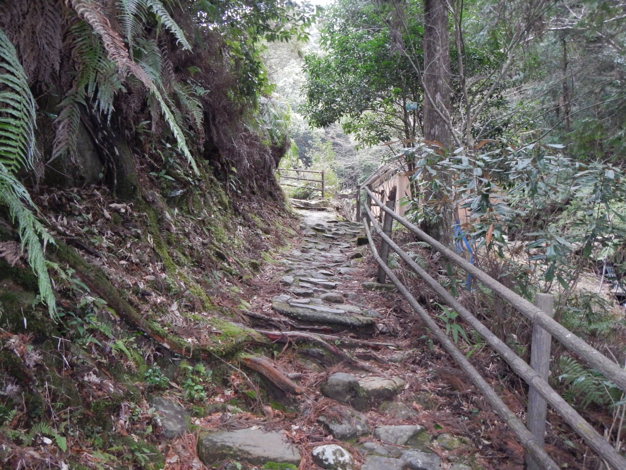 石段が続きます。足腰に自信の無い方は、杖(無料)を借りましょう