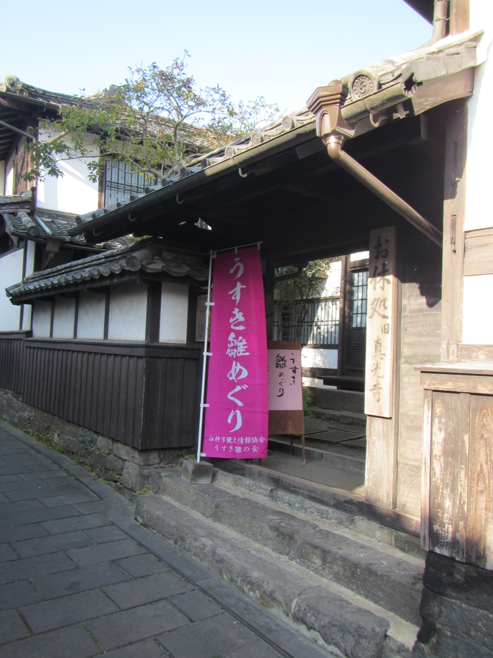 臼杵駅から歩いて15分くらい。案内が出ていますので地図が無くても迷うことは無いでしょう。うすき雛めぐりをやってました。旧真光寺におひな様が展示してありました。古い街並みは、なかなかよいのですが、その街並み自体に飲食店や土産物屋さんなどのお店が無いので、物足りない感じがするかも知れません。飲食店や土産物屋さんなどは少し離れた八町大路にあります。