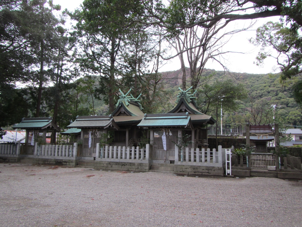神木として昔時より里人に崇尊せらるゝ巨樹は本殿の右側に在り、樟・胆八樹の双生樹にて両樹互に密着し、地上約八尺の処にて分岐す。