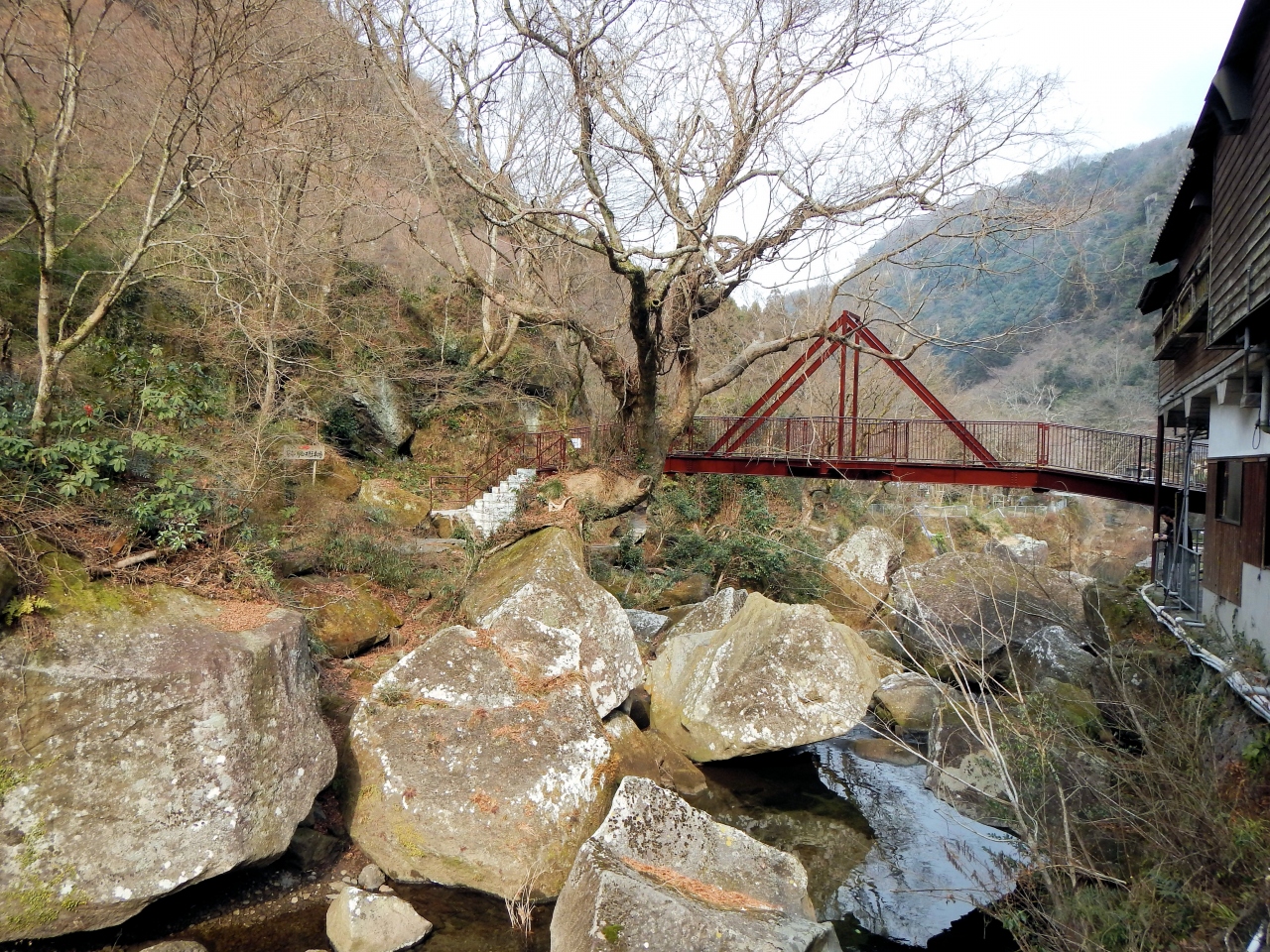 紅葉の季節にはすごく混むという話でした。狭い道しか無いのでその季節には注意が必要です。1月に行きましたのでガラガラでした。紅葉や新緑は楽しめませんでしたが、ごつごつした岩肌はよく見えました。展望所からの一目八景が有名ですが、川沿いの遊歩道も良かったです。写真については昼の1時過ぎでしたが、逆光になってうまく撮れない箇所もありました。
