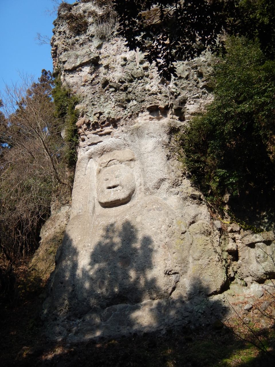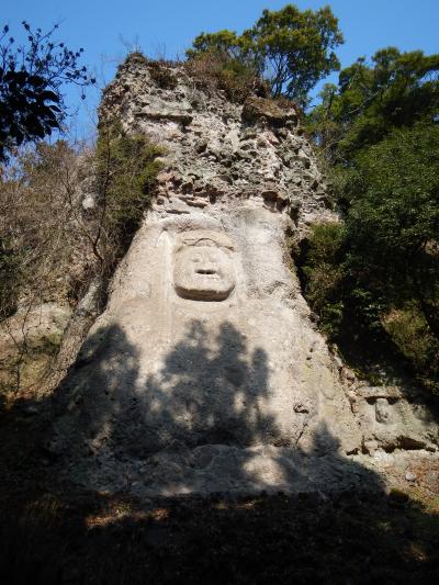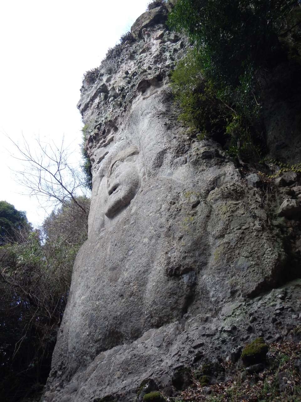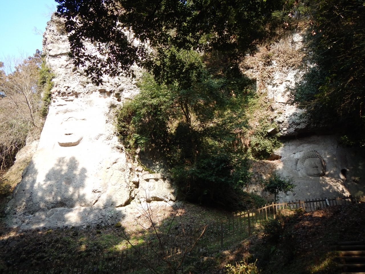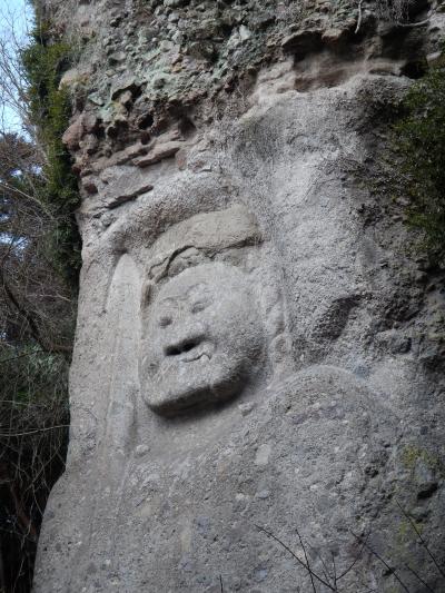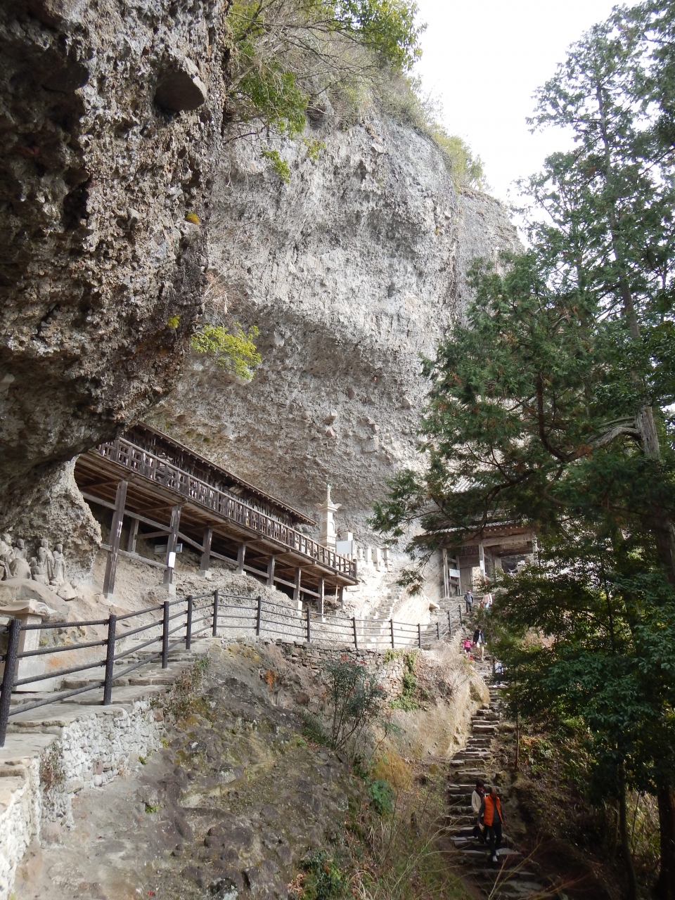 最上部3分の1くらいは、乱積の石段ですので、登るのに苦労します。特に下りは足を踏み外さないように気を付ける必要があります。2014年1月石段の階段の横に手摺が出来ていました。少しは楽になったと思います。真っ直ぐ前を見てひたすら石段を登っていくと、磨崖仏を通り越してしまいますので注意しましょう。磨崖仏は途中の左手にありました。また、磨崖仏の前には柵がありますので、直下までは行けません。