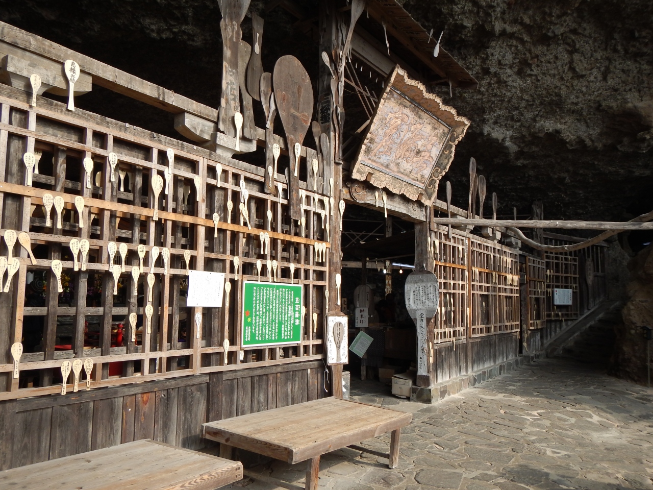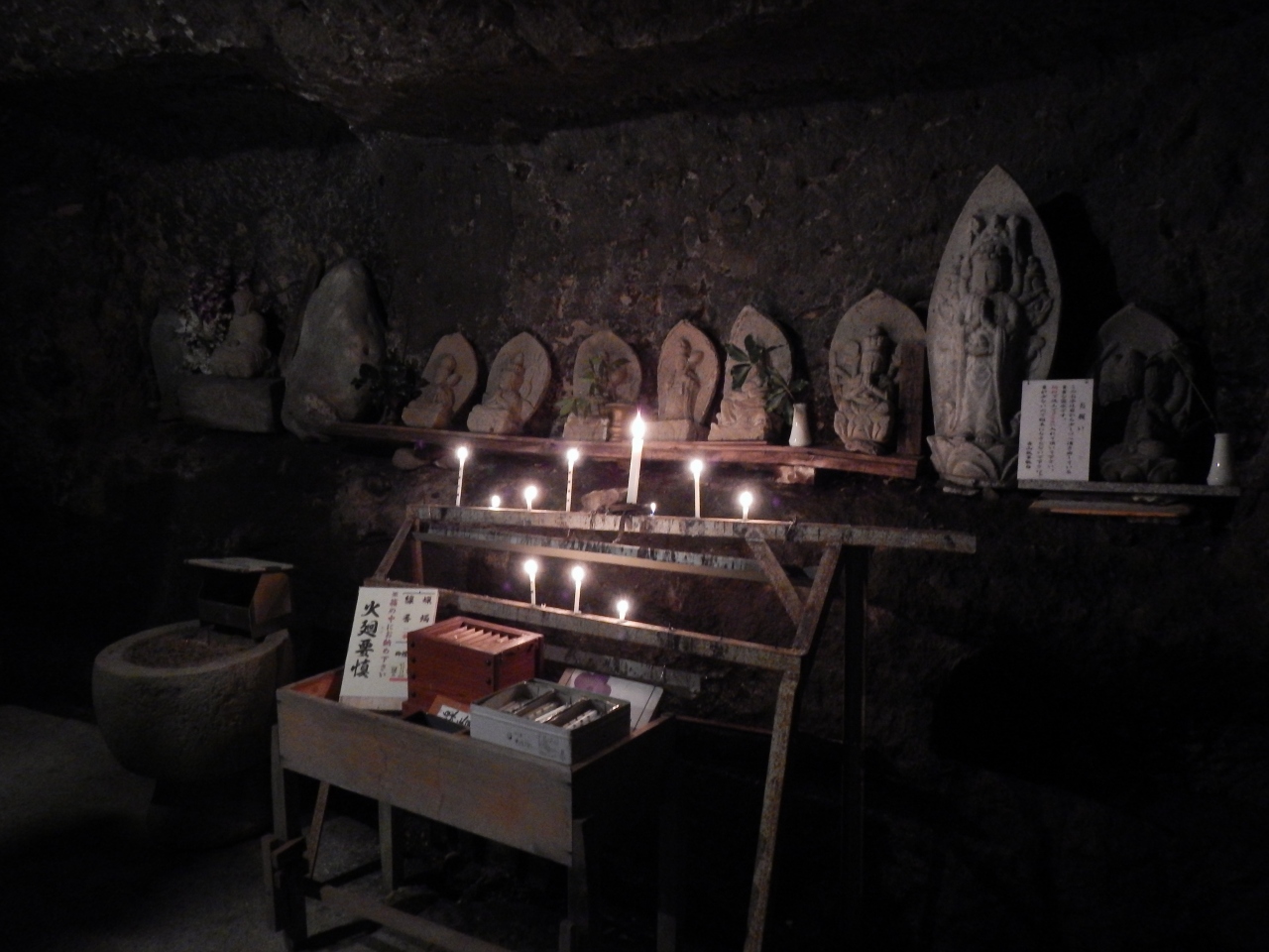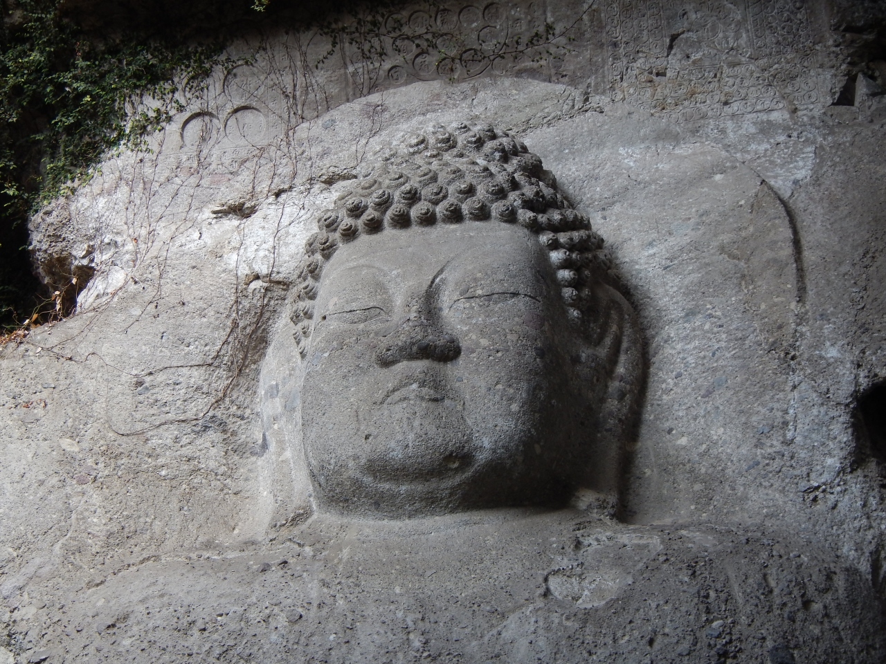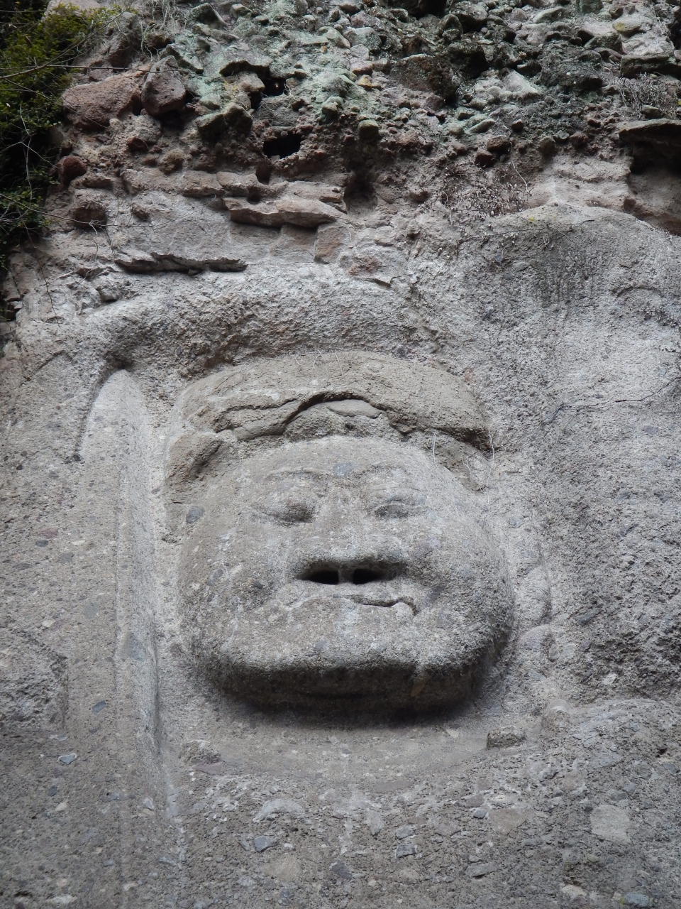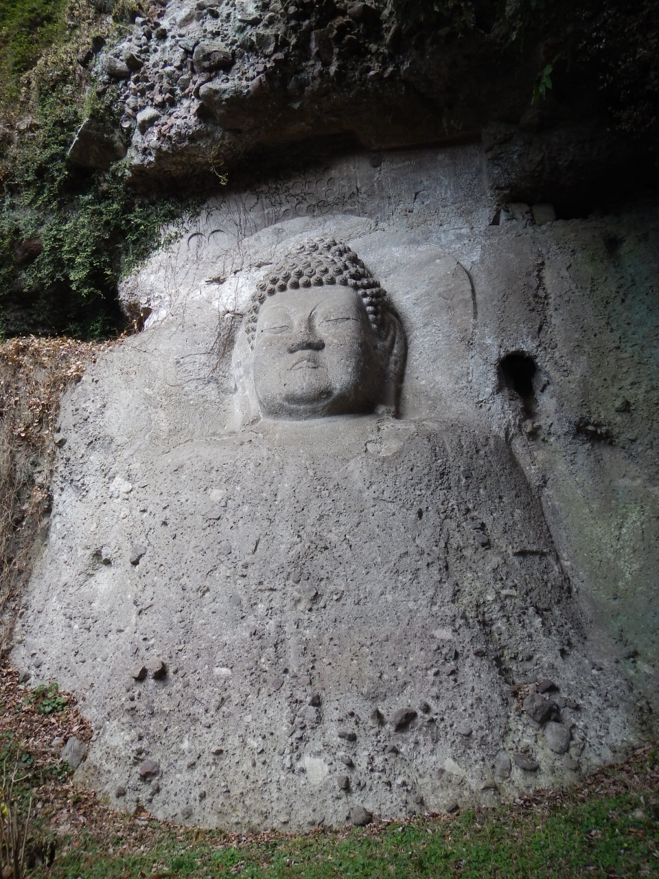 最上部3分の1くらいは、乱積の石段ですので、登るのに苦労します。特に下りは足を踏み外さないように気を付ける必要があります。2014年1月石段の階段の横に手摺が出来ていました。少しは楽になったと思います。真っ直ぐ前を見てひたすら石段を登っていくと、磨崖仏を通り越してしまいますので注意しましょう。磨崖仏は途中の左手にありました。また、磨崖仏の前には柵がありますので、直下までは行けません。