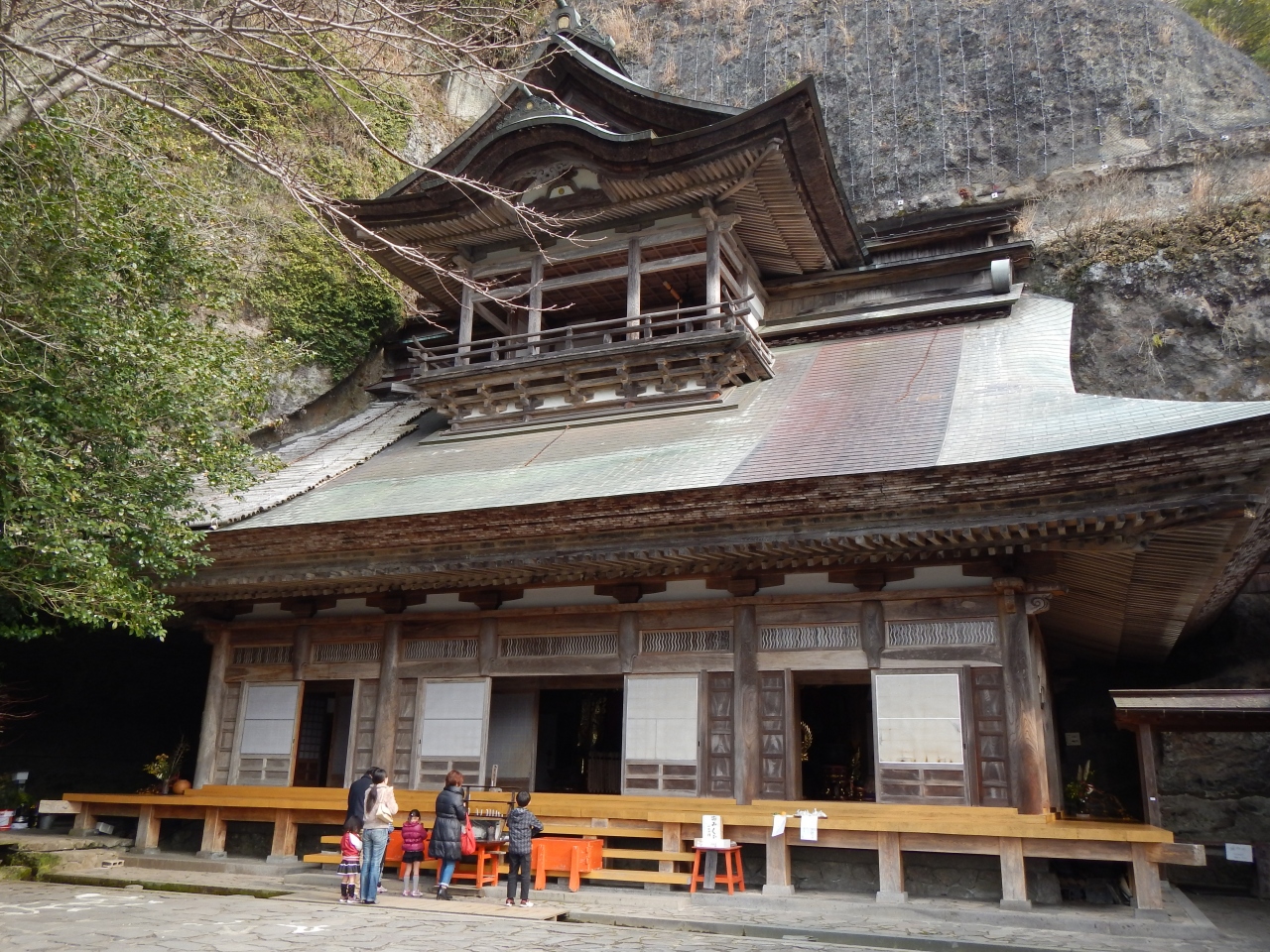 ここから180度岩肌の渓谷美が見渡せます。紅葉の時期には大変な人出になるという話でしたが、2014年1月に行きましたので、貸し切り状態でした。昼の1時過ぎでしたが、部分的に逆光になる箇所がありました。写真を撮る場合は注意が必要です。