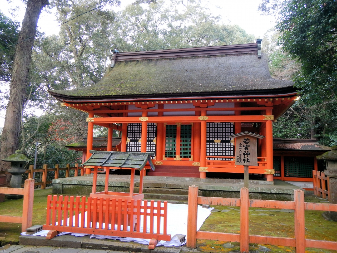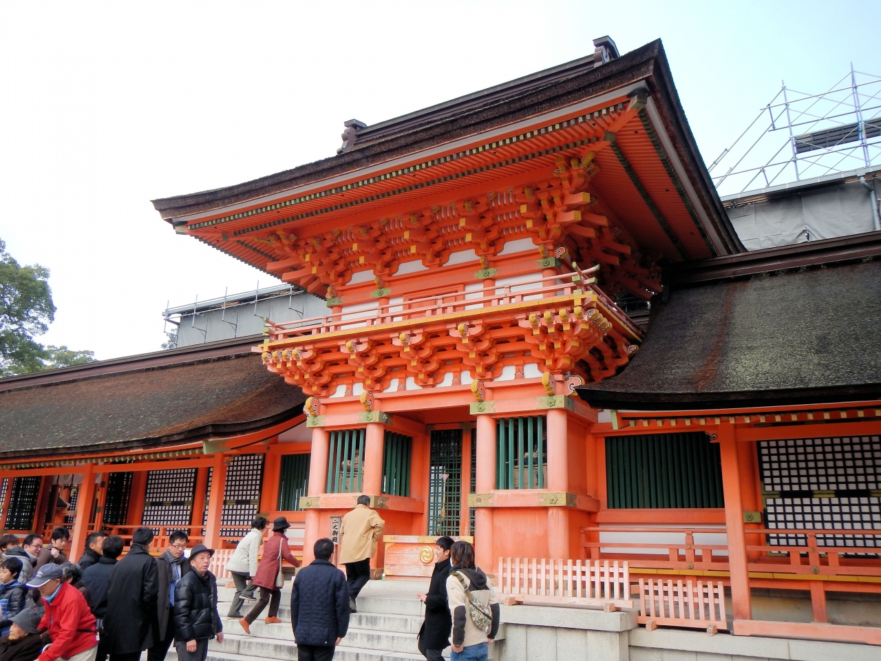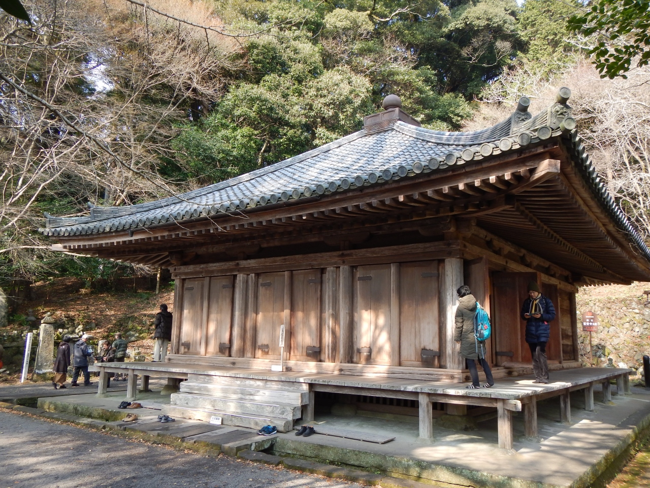 駐車場から上宮までかなりの距離があります。上宮・下宮を参拝して戻ってくるのに最低30分はかかります。国宝孔雀文磬が展示してある宝物館まで見ると1時間は見ておいた方が良いでしょう。それと通常、参拝しているのは、南中楼門(勅使門)の前です。国宝の本殿はこの中に有り、見ることは出来ません。