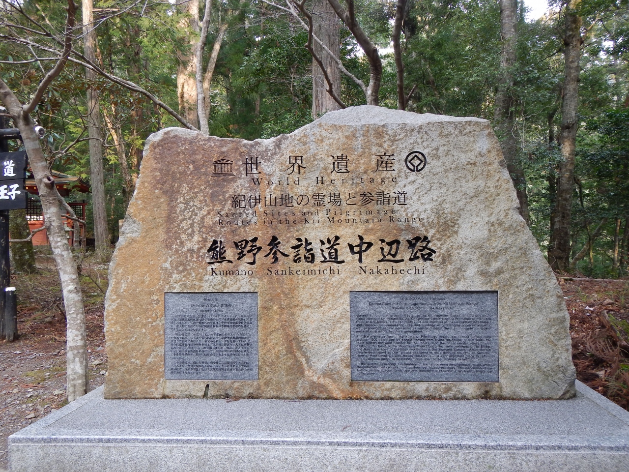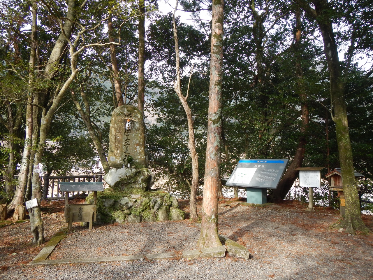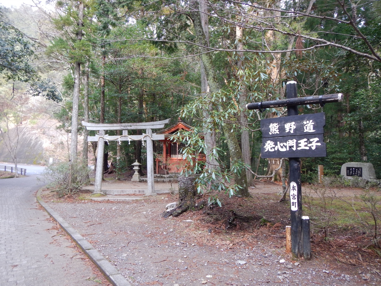 熊野古道中辺路のハイライト(初心者向け)コースがこの発心門王子から熊野本宮大社への道です。川湯温泉の旅館に泊まったら、朝ここまで送ってくれました。バスの便もありますが、13:00台の発着が最終ですから、それ以降ここに着いても、歩くしかありません。世界遺産と書かれたでっかい石碑が出来ていました(2014年1月)