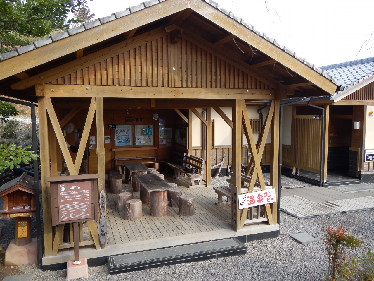 休憩所・トイレ・温泉コーヒー・記念スタンプがありました 実際の景色は熊野大社本宮を伏して拝むという感じはありませんでした