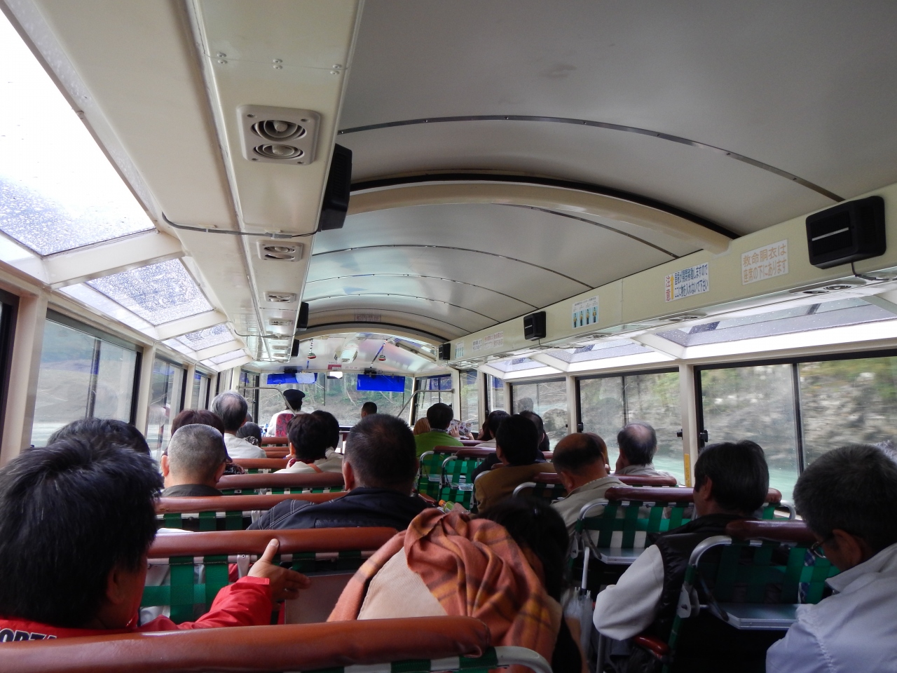 席は片側2列です。前後の間隔は狭いです。座席は指定されます。自分で選ぶことは出来ません。前後も左右も狭いので、問題なければ荷物は預けて持ち込まない方が良いです。天気が良ければ途中で天井が開いて、上の景色を楽しむことが出来ます。途中、一旦下船して休憩がありました。トイレもありましたが、場所がらか、男女共用であまりきれいではありません。