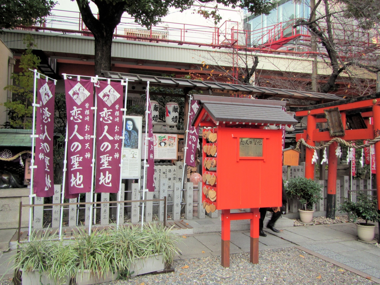 恋人の聖地で売り出し中です。のぼりがいっぱい立っていました。曾根崎心中=心中となると、聖地にはなりませんので、曽根崎心中は封印されて居るみたいです。