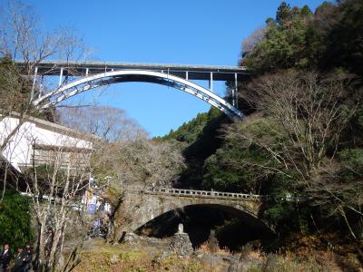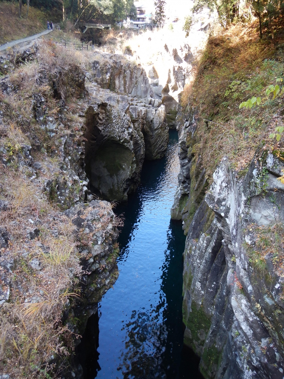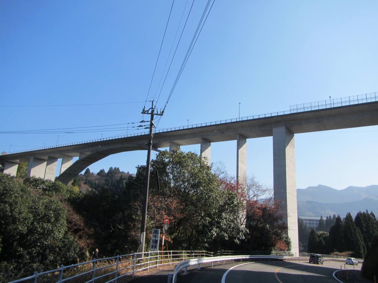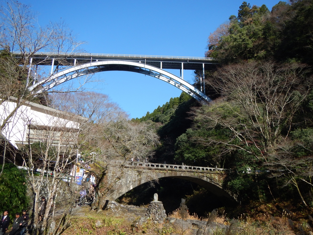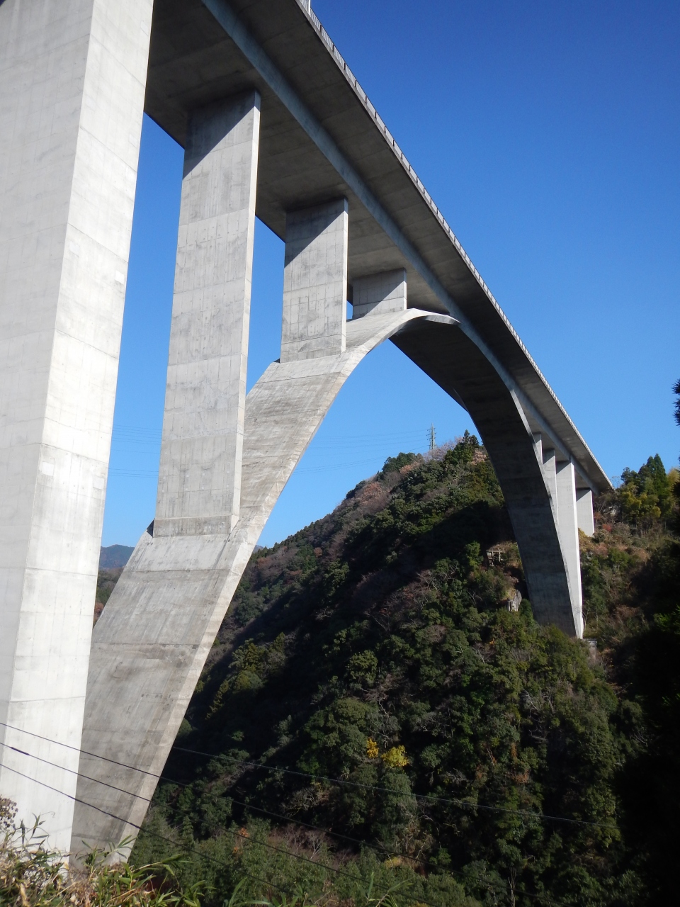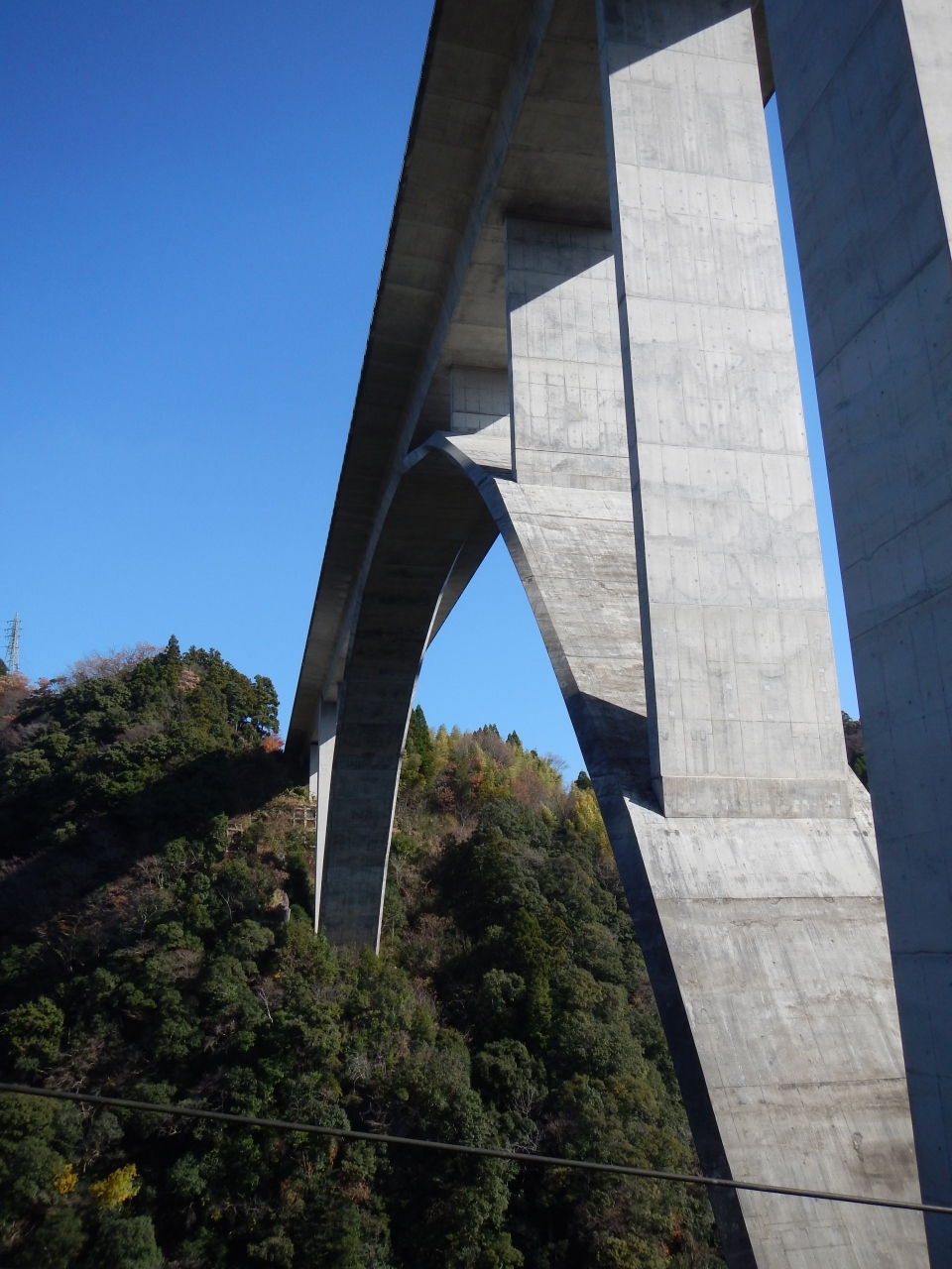 高千穂峡にかかる3本の橋の内、一番新しい橋です。高千穂峡の遊歩道からよく見えます。古い2本の橋は景色に溶け込んでいる感じですが、この新しいコンクリートの橋は、自己主張が強すぎて、高千穂峡の景観から完全に浮いてしまっています。
