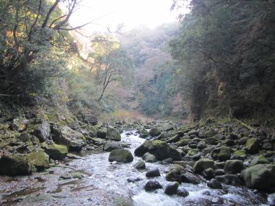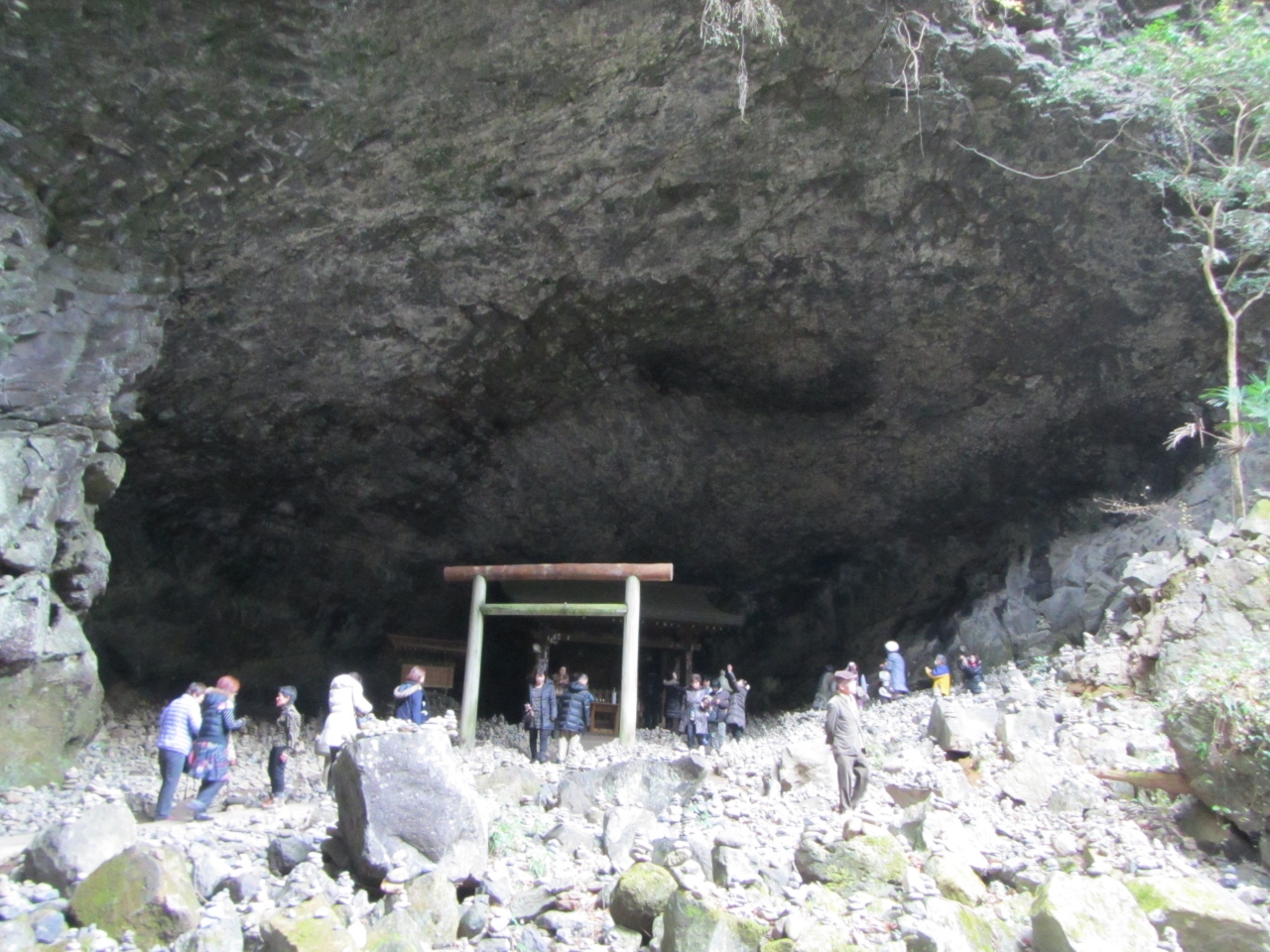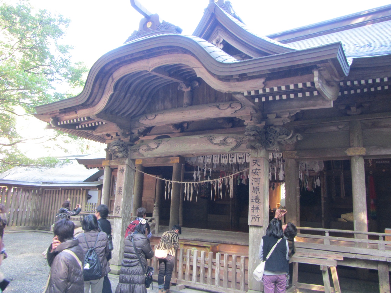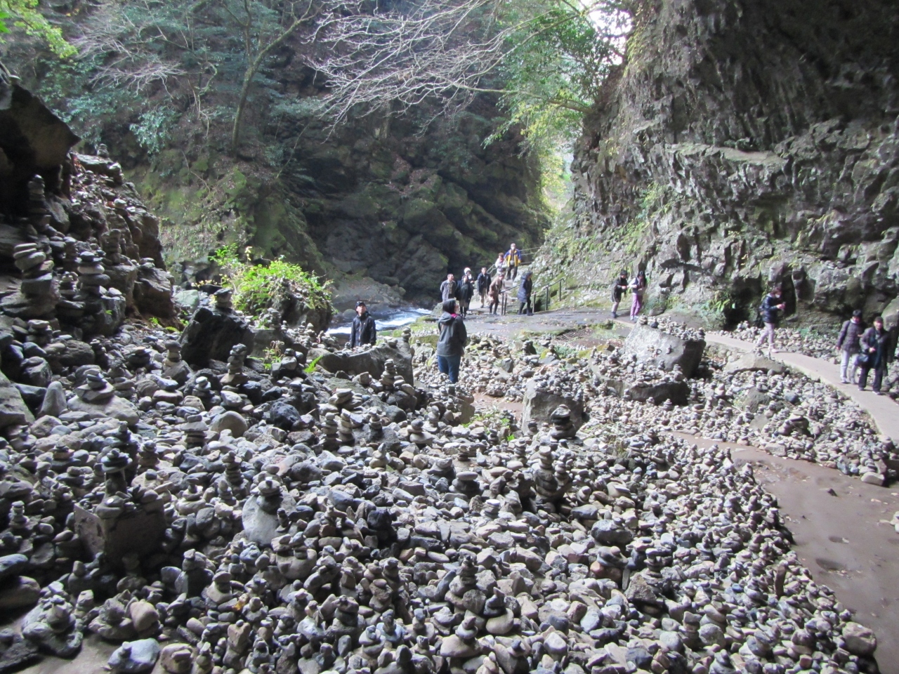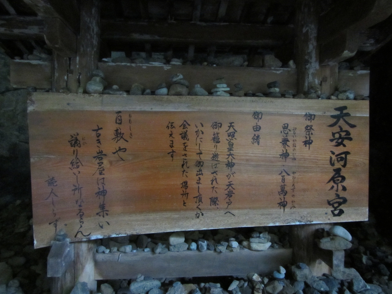賽の河原のように小石が積まれた河原です。正式には、天安河原宮という神社で、祭神は思兼神と八百萬神です。天岩戸神社西本宮から車道を少し歩いて、途中、川へと下っていったところにあります。案内板があります。帰りは登りの坂道になります。天照大神が岩戸に隠れたさい、天地暗黒となり八百萬の神がこの河原に集まり神議されたと伝えられる大洞窟ですが、深くまで続いている洞窟という感じはしませんでした。