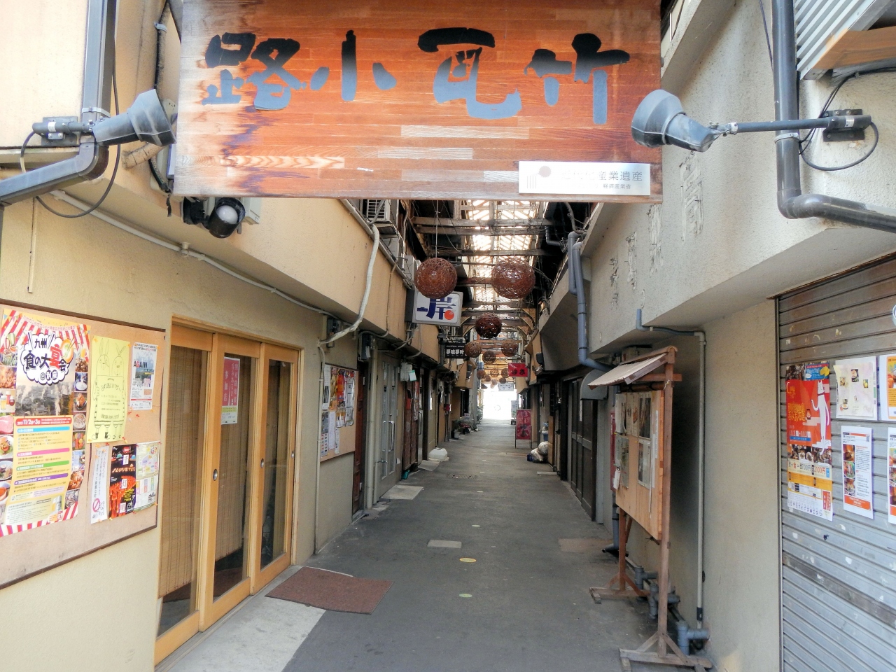 有名な竹瓦温泉のすぐ横にあります。近代化産業遺産に認定された日本最古の木造アーケードです。朝7時に行ったら、店はどこも閉まっていました。入ったところに説明の書かれた案内板がありました。通路幅は狭いです。木造の三角屋根でガラスがはまっています。