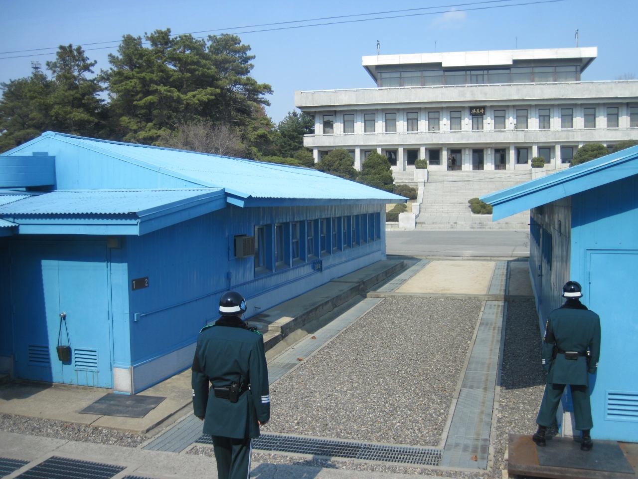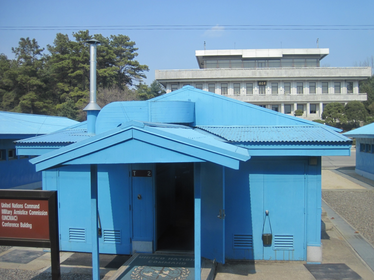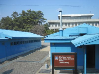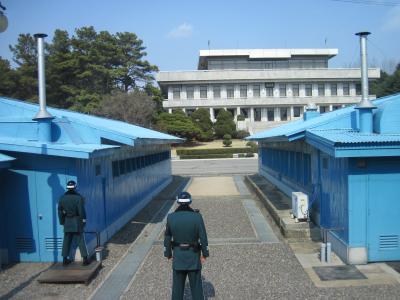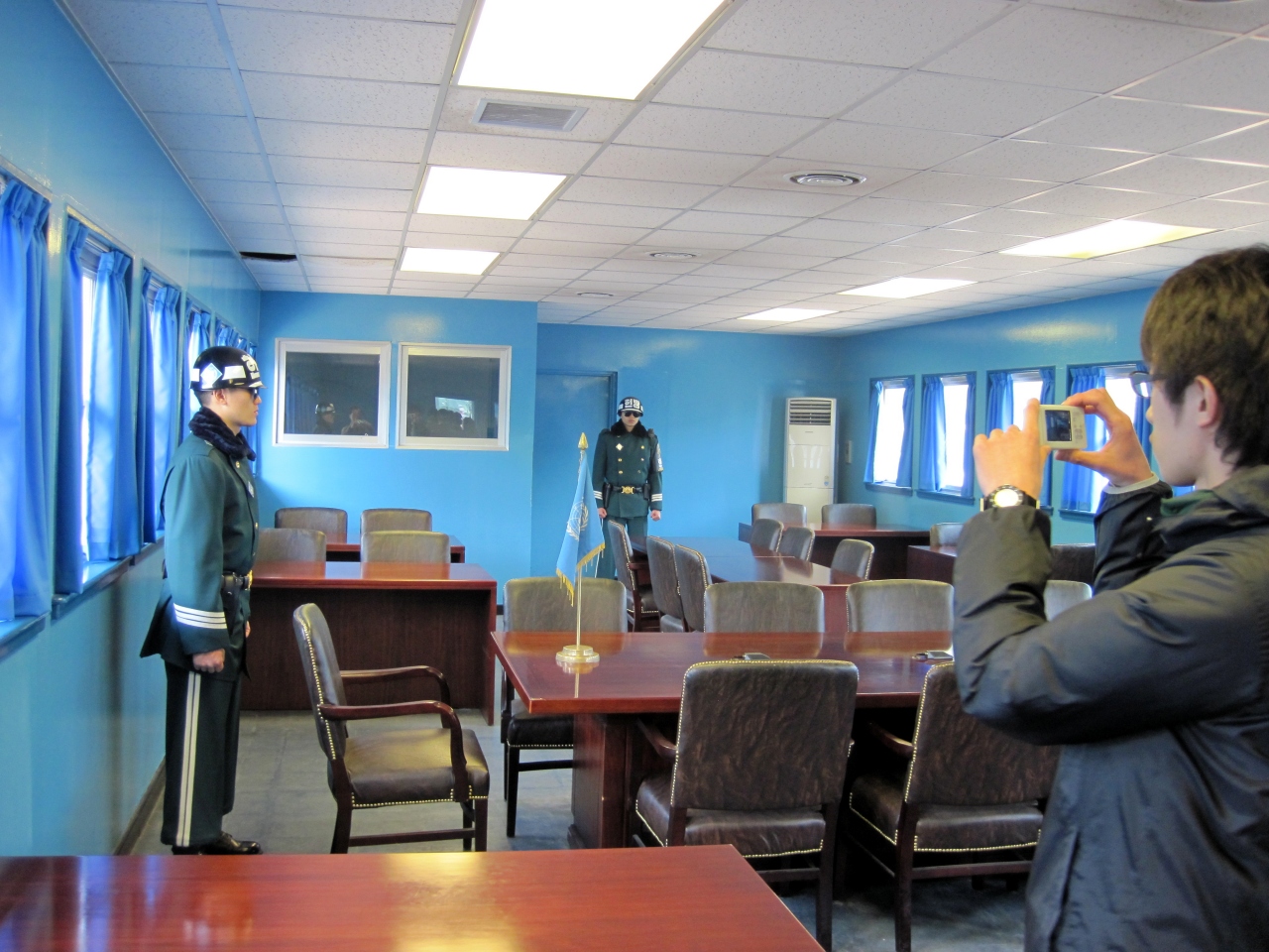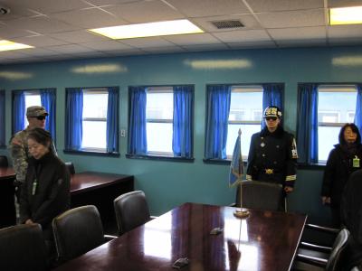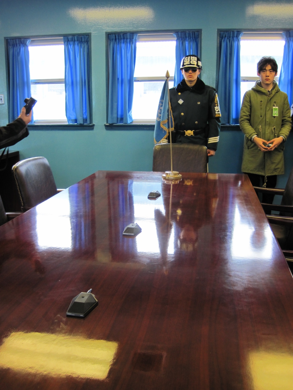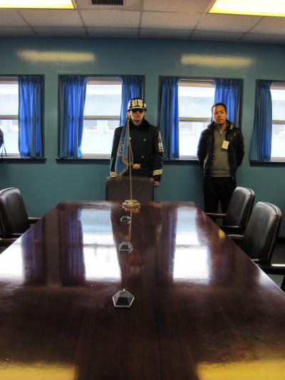 軍事停戦委員会 本会議場の中には、警備の兵士さんが2人いました。1人は境界線上。もう1人は北朝鮮側への出口の前です。境界線上の兵士さんとは、いっしょに写真を撮ることができますが、あまり近づき過ぎてはいけません。30?以内に近づくと、銃を奪われる恐れがあるので、兵士さんからどういう攻撃をされても仕方が無い、すべて近づき過ぎた自分が悪い ということなので注意するようにと言われました。