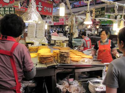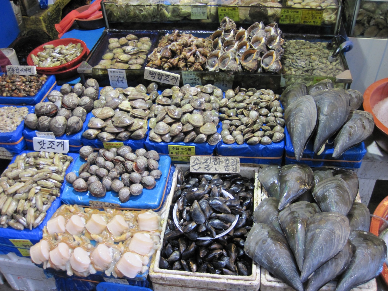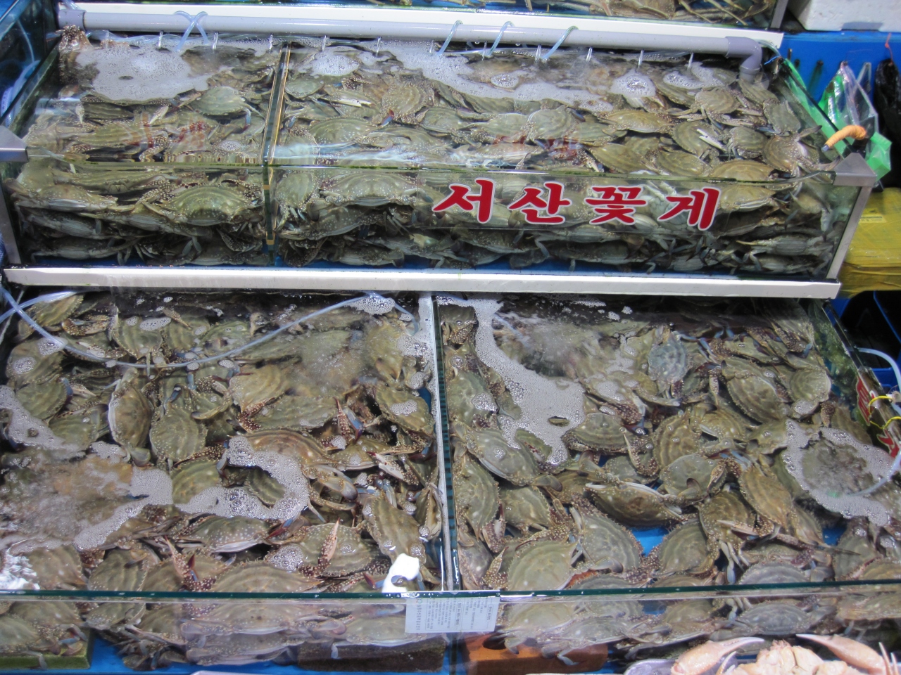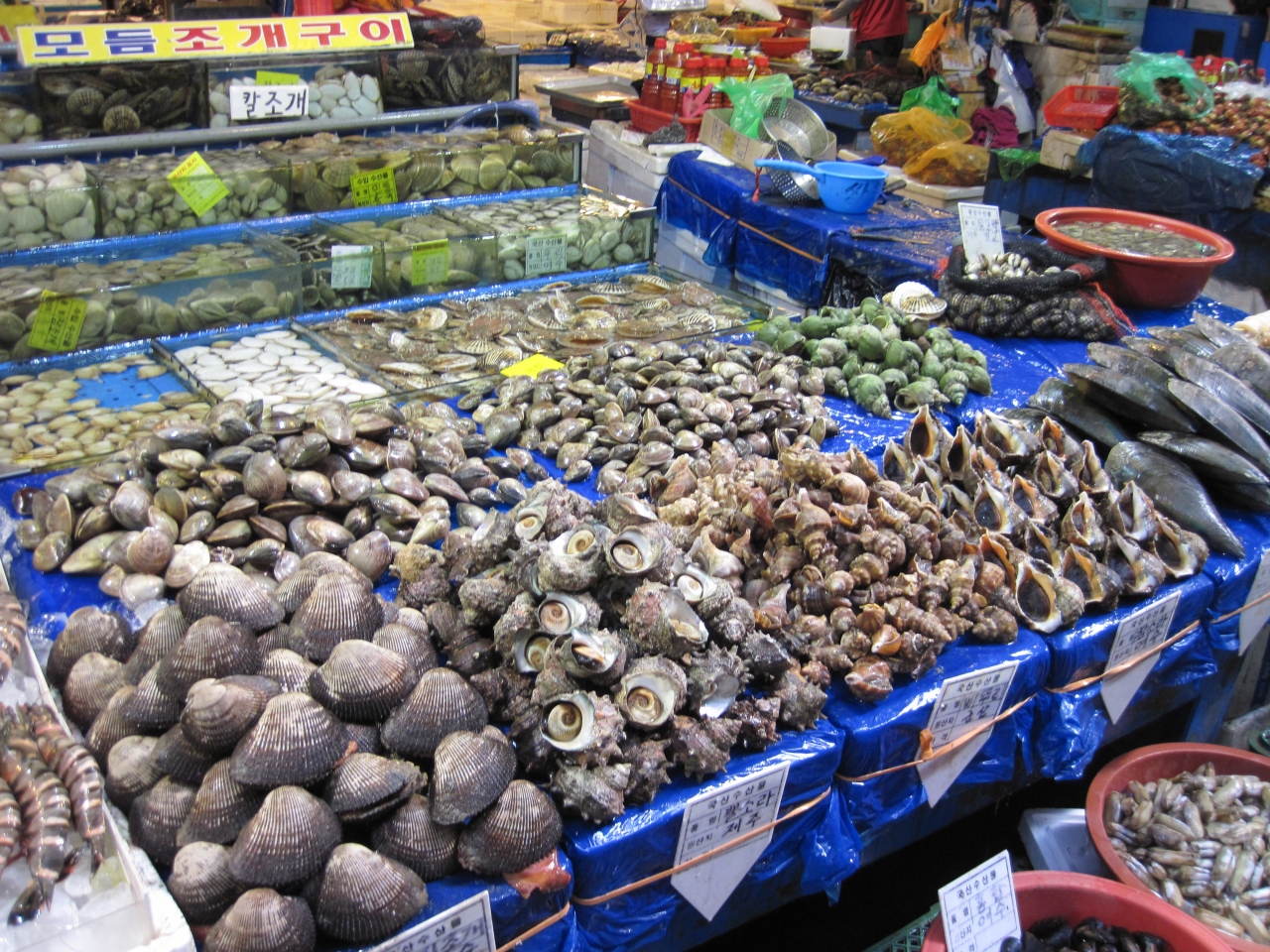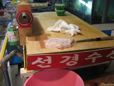 巨大な水産市場です。誰でも入ることができます。システムは、下記の通りです。普通は、平目の刺身が売りです。まず、あちこちの店を見て歩きます。何となく、雰囲気や泳いでいる平目の状態が良い店を見つけたら「オルマエヨ」といって、平目のお刺身1匹いくらか聞きます。多分高く言ってきますので、ジェスチャーでも良いので、下げて欲しいと言います。粘れば、1匹2.3万ウォンになるかもしれません。こちらがOKすると、その場で捌いて、刺身にしてくれます。アラとかも一緒に皿に盛って渡してくれるので、同じビルの1階の駅側に固まっている料理店に行ってそれを渡せば、いろいろ付けて、刺身と鍋を食べることができます。鍋代は人数にもよりますが、そんなに高くはありません。