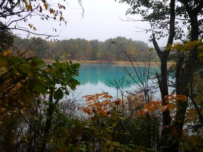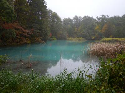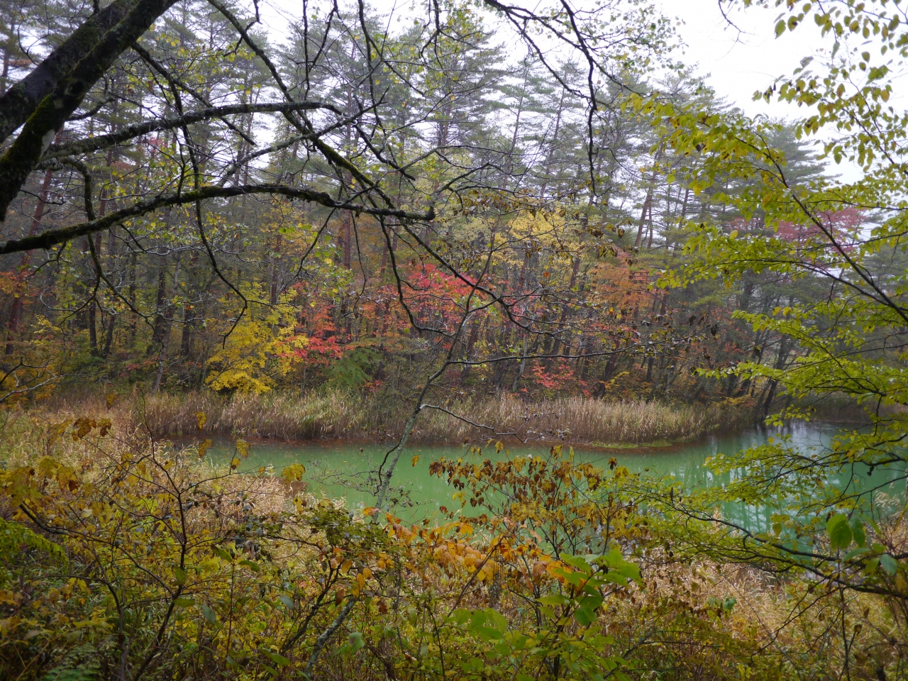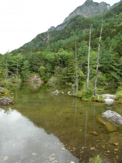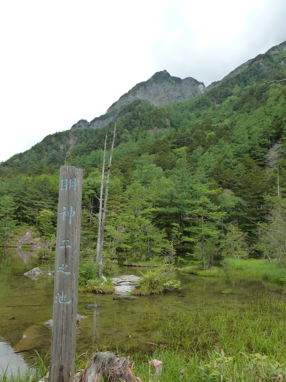 過ぎたらすぐに明神池があります。「明神一の池」は木々の緑色が