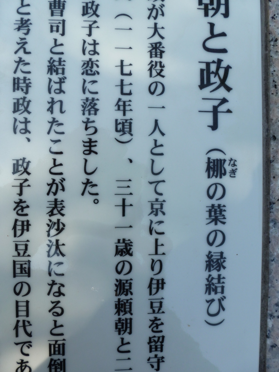 石碑の横に梛の木(なぎのき)が植えてありますが、頼朝と政子は梛の木の下で