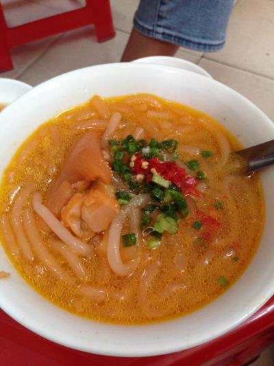 Banh Canh Heo(豚足入り、ピリ辛、太タピオカ麺)。ライムを...