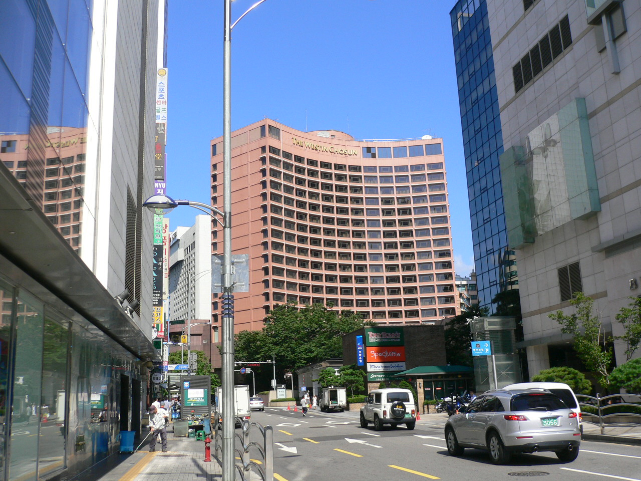 今回は新館に宿泊。ロッテ免税店やロッテ百貨店はホテルの横、南大門市場も徒歩2~3分と申し分のないホテルです。エントランスでつながっている本館の1Fにも免税店がありちょっとしたお買物に便利でした。朝食のビッフェは地下1F「ラ・セーヌ」で。とにかく種類が豊富。本館1F免税店奥の「ペニンシュラ」こちらはNGです。場所が分りにくい上に種類が格段に少ない。お勧めはやはりラ・セーヌです。でも日本人サラリーマンが朝食用の小分けの韓国のりを大量に持ち去っていましたがあれはいただけませんね。お土産は自分で買いましょう☆あとはオプショナルツアーバスの出発ロビーが本館の6階にあります。今回は新館だったので下りて上ってと結構面倒でした。次回は料金もお安い本館もありかなと思っています。OP出発前はここのロビーの隅に小さなウォータークーラーが置いてありますので空のペットボトル持参で行きましょう。食事付きのツアーはほとんどが飲み物が別料金です。必ず最初に飲み物を聞かれ、お高いウーロン茶を飲むはめになります。ひどい所は飲み物を頼まずにお水をお願いしても中々持ってきてはくれません。なのでここでミネラルウォーターをGETしてから出発しましょう。