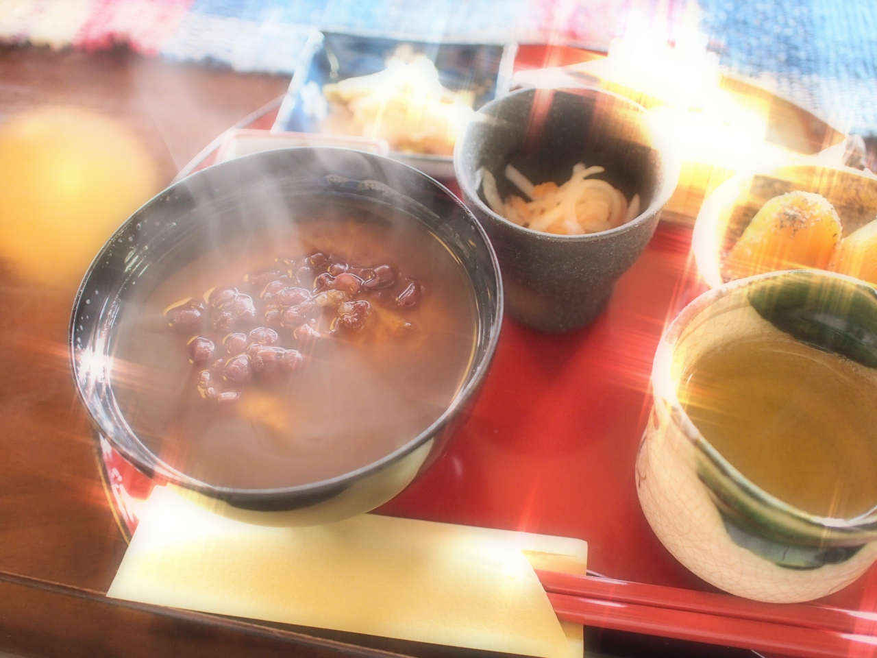 とちもちぜんざいの他に小芋の煮たものや酢の物、お漬物などなど