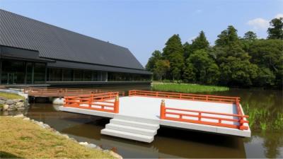 せんぐう館脇、勾玉池の前に屋根付きの休憩所があります。