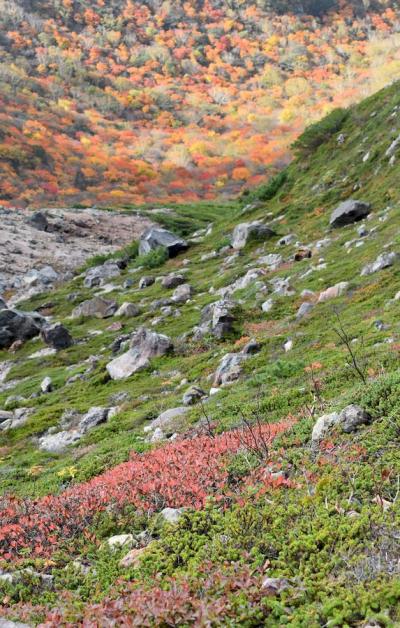 紅いドウダンツツジと岩の転がる緑の斜面の向こうにはカラフルな紅葉の樹林...