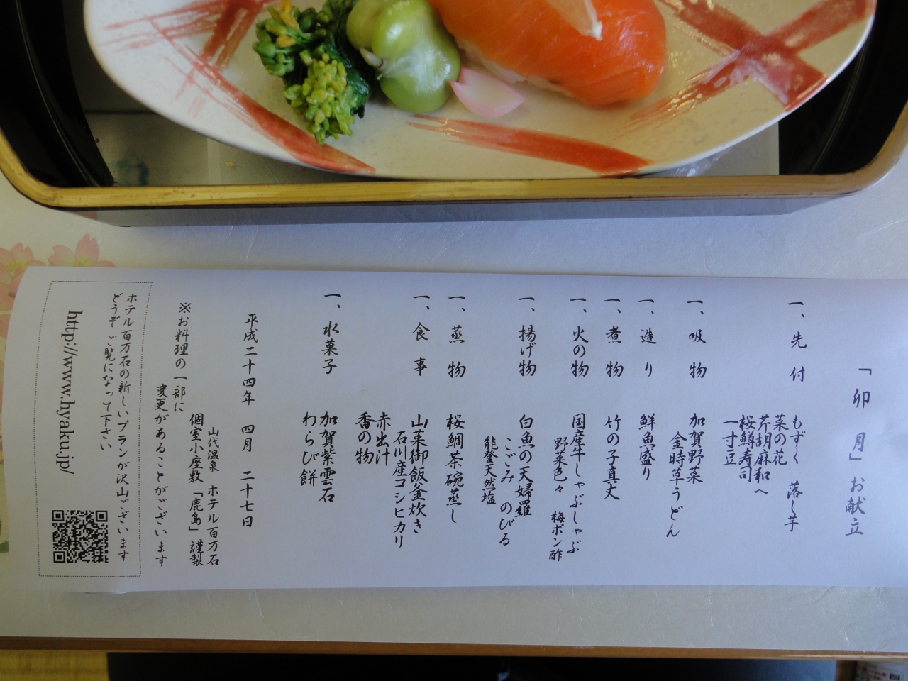 温泉でのんびりと体を癒した後はホテル3Fの鹿島にて日帰り入浴とパックになった彩り膳を頂きました。さすが老舗の料理で、加賀野菜の金時草を練り込んだうどんや旬の筍のしんじょう等の春の食材を多々取り入れた洗練された会席料理で、初めから終わりまでとても美味しく楽しませて頂きました。