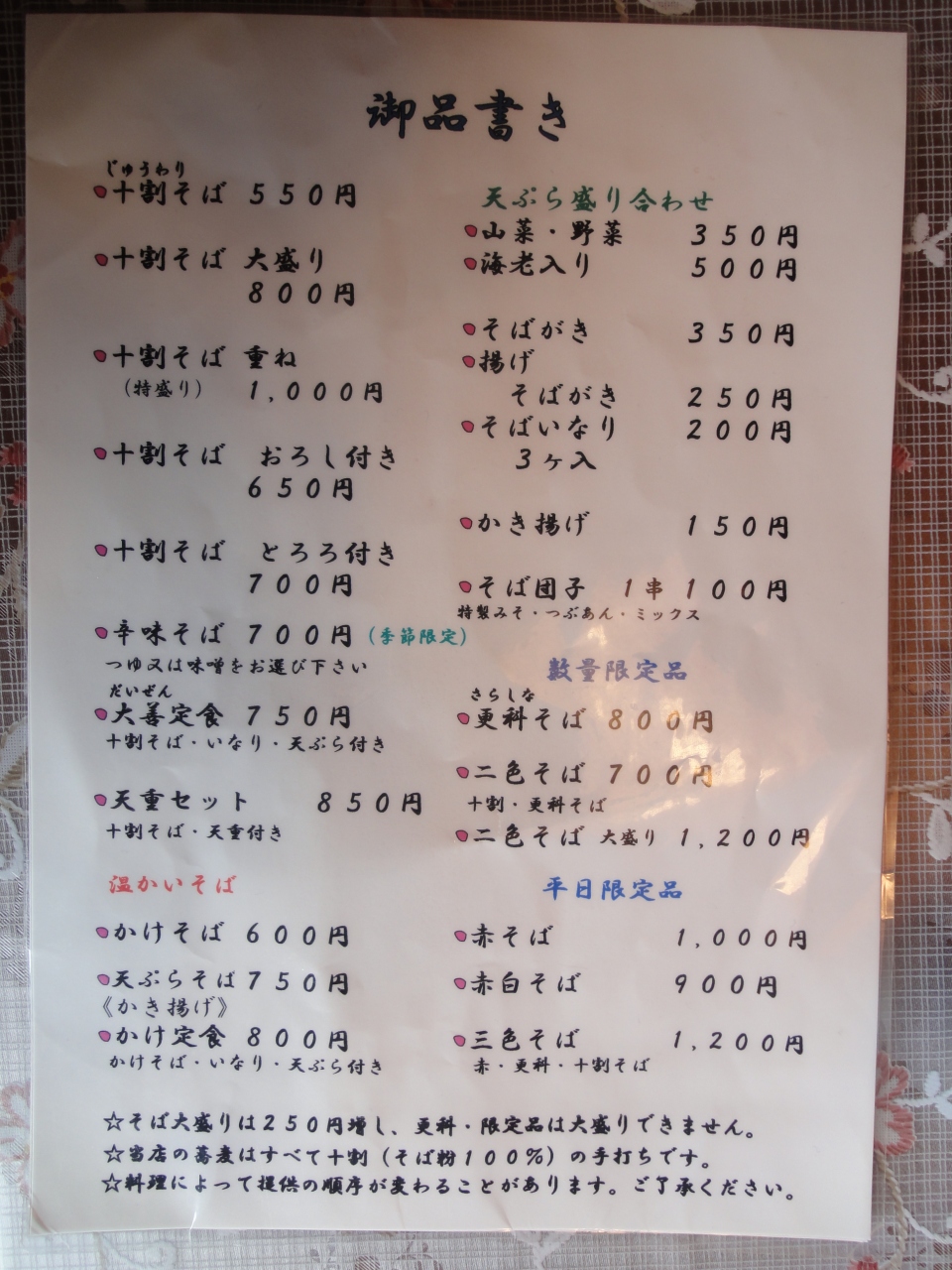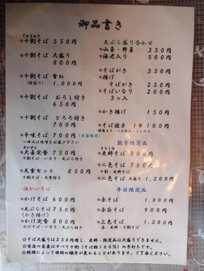 私は十割そば(550円)、連れ合いはかけそば(600円)にそれぞれ海老入り天ぷら盛り合わせ(500円)を追加して注文しました。