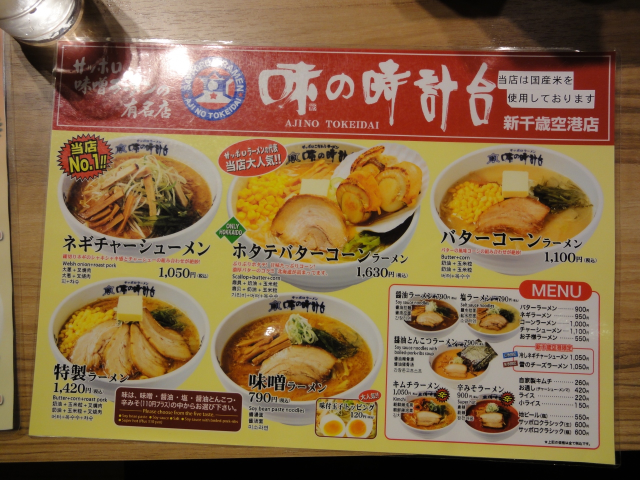 昼前に千歳空港に到着し、まずはラーメンで昼食を摂る事にして新設されたラーメン道場へ行きました。 10軒のラーメン屋さんがずらりと並びどれにするか迷うところですが,予め目星を付けておいた味の時計台へ。 昼には少し早かったのでお客さんも未だ少なく、そのまま席に案内され、味噌ラーメン(790円)を注文。 程なく出された味噌ラーメンはニンニクの香ばしい香りが食欲を誘います。 メニューの写真と比べると少なめのシナチクはまだ良いのですが、チャーシューがかなり小さく物足りないです。 せめてメニューの写真と同じ位の大きさにして下さい。