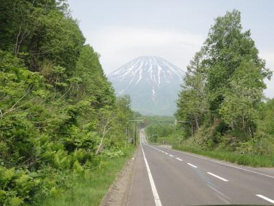 途中、喜茂別からふきだし公園へ向かう若干の登り道を過ぎて下りに掛かった所で、道の真正面に道路の両サイドの木々に挟まれる様にしてそれまでちらちらと見えていた羊蹄山の姿が現れます(羊蹄山に向かって道の右側に小さな展望駐車場が有ります)。