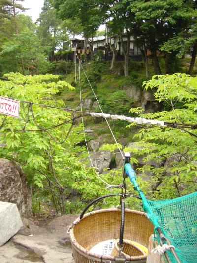 名物の”空飛ぶ団子”。ロープで繋いだ籠にお金を入れると、対岸のお店がお...