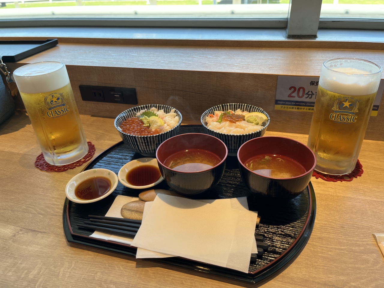 旭川観光の終わり、帰途につく前に空港内のフードコートにあるお店。ジンギスカンやラーメン等の旭川定番のメニューの中で北海道といえば定番なのに忘れられていた海鮮丼が食べられるお店。ここで海鮮丼を食べれば、パーフェクトゲームだ。当然、新鮮で美味しい。1人前は無理かな、と思っても、ミニ丼2つとビールというほろ酔いメニューがある。これにビールを追加して相方とシェアしたが、サービスで味噌汁を2人分にしてくれた。