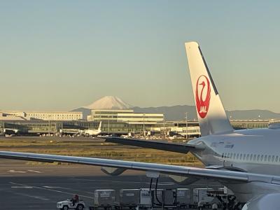 これからの空気が澄んだ季節はここからも富士山がよく見えます。今回は早起きして7時10分発の便に乗るためにターミナルにいたのですが、JALの鶴のマークの隣に富士山が見えました。日本を象徴するような絵面です。早起きした甲斐がありました。
