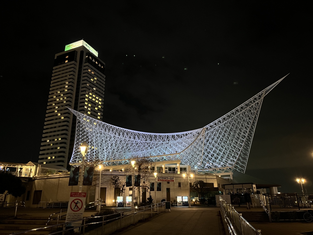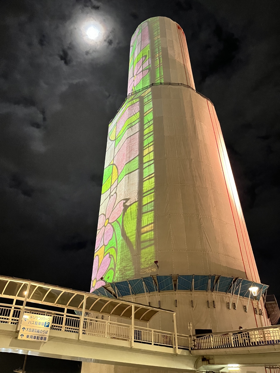 メリケンパークの夜景見学ではどうしても欠かせないスポット。特徴的な建物の形に加えて、一定のインタバルでライトの色が変わり、夜景の主役のようだ。背後のオークラと共に絵になる風景だった。オークラの1階のカフェレストラン カメリアからもよく見える。