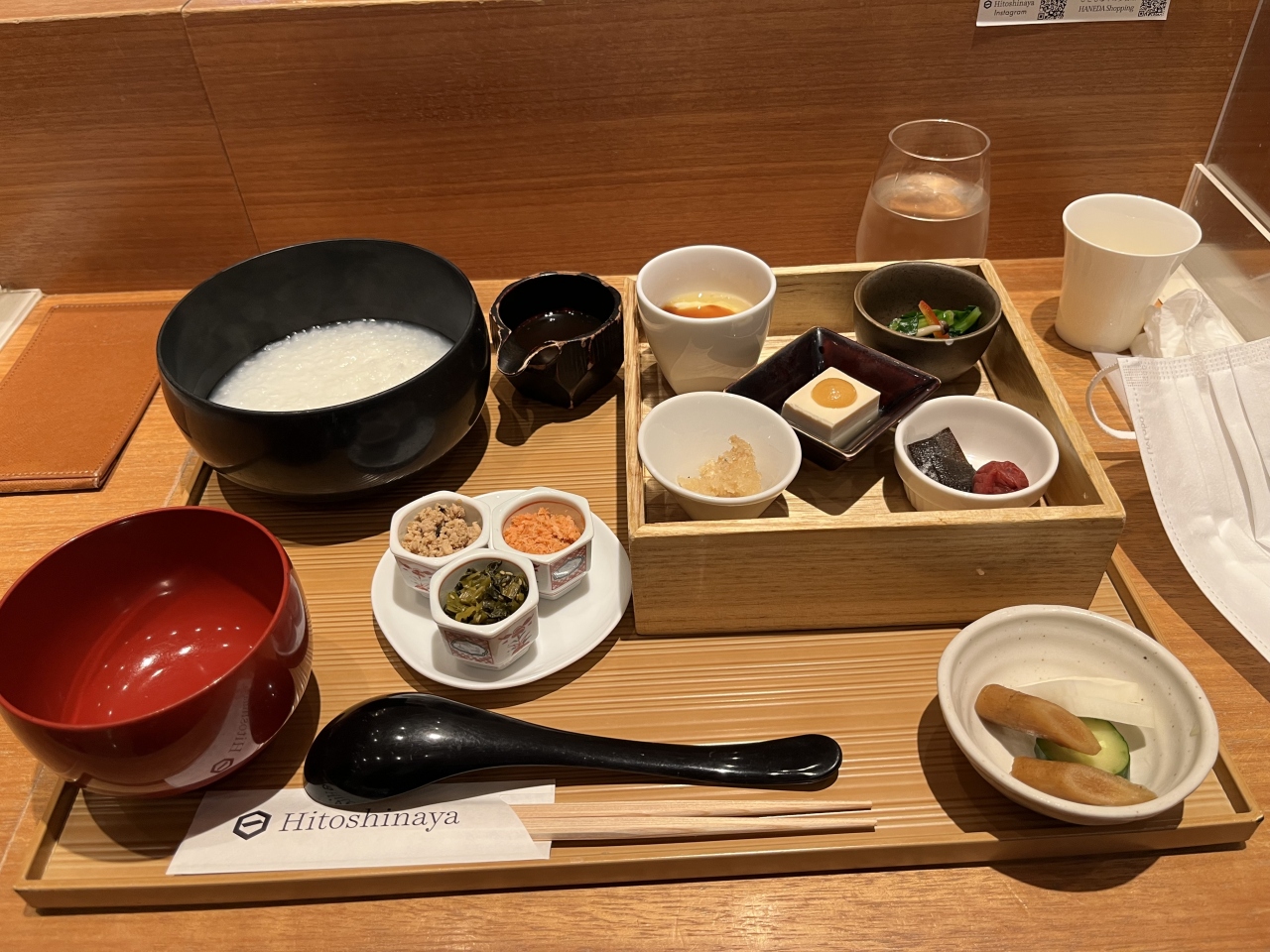 羽田空港のチェックインカウンター前、保安検査前のロビーにある。美味しい和食の朝食屋さん。お粥か焼き魚定食が選べる。お粥が美味しい。おかずというかお粥のお供が種類豊富に載ってくる。これだけいろんなお供があると、ペロリと平らげてしまう。お粥の食べ過ぎに注意である。