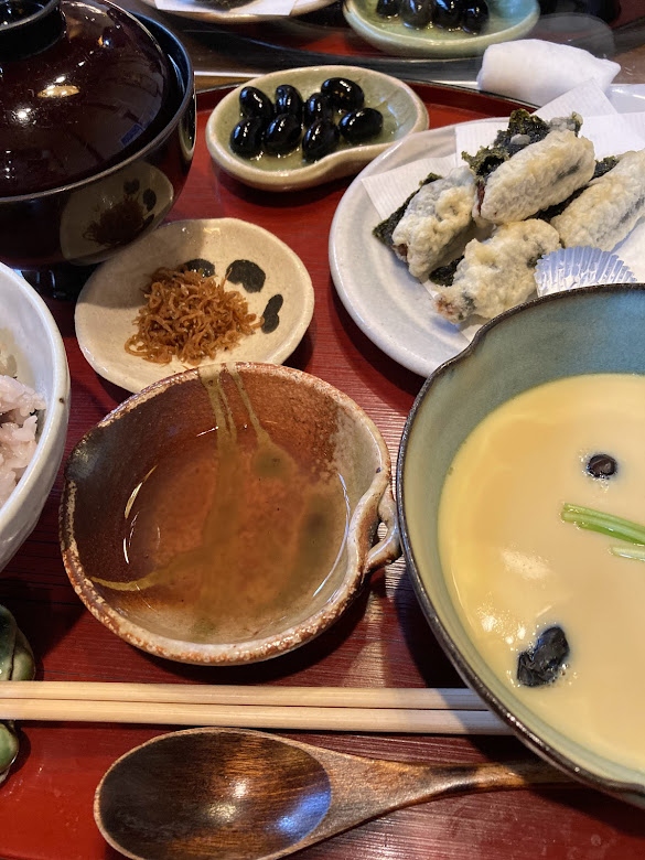京都の錦市場の中にある店舗です。京都らしく奥に細長い建物になっていて、奥のこじんまりしたスペースが飲食スペースになっています。ランチをいただきました。黒豆尽くしのお料理で、品数も豊富。どれもおいしかったです。