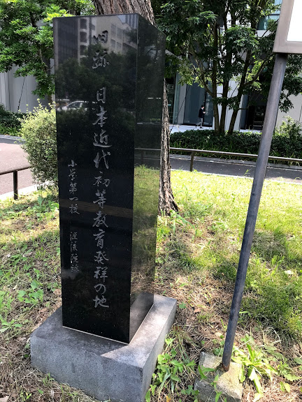 御成門・大門界隈を歩いている途中で偶然見つけました。緑地帯の部分にぬうっと墓石のように立っている石碑です。この近くに昔の小学校の大元があった、ということのようですが、この石碑以外は往時を偲ばせるものはありませんでした。わざわざ見に行くというよりは、何かのついでにちょっと見てみる、という感じでいいと思います。