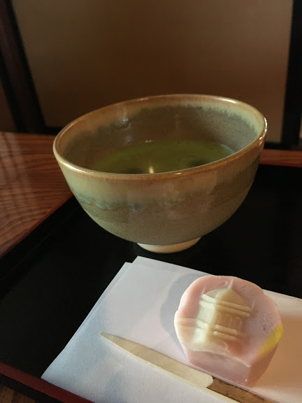 抹茶と和菓子のセットを頼みましたが、和菓子が岩崎邸の塔を模したデザインになっているなど、凝っていて可愛らしいです。- 旅行時期