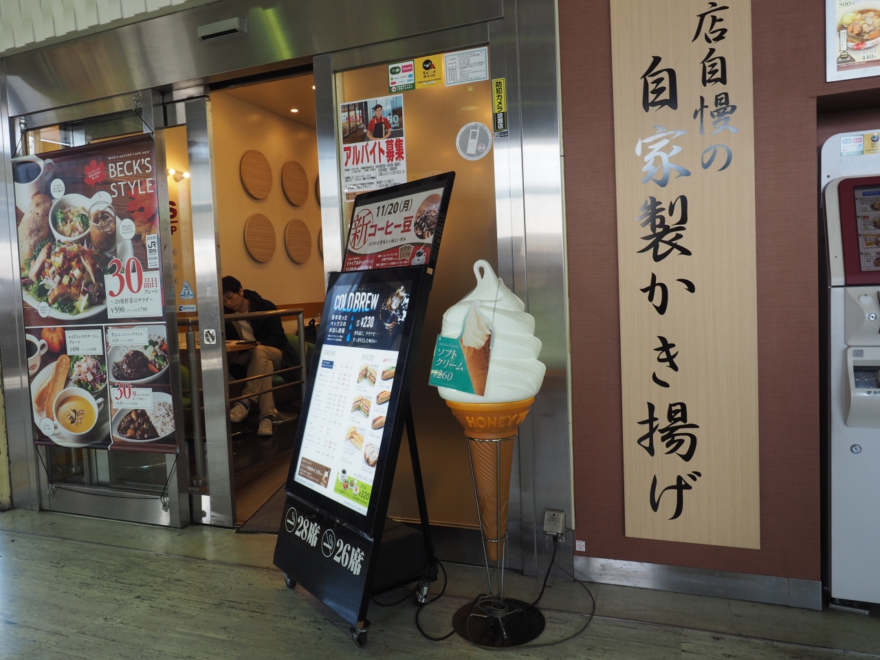府中本町駅の構内にあるコーヒーショップです。行った日がちょうど競馬のレースがある日だったようで、駅構内自体も大混雑(でもみんな競馬場を目指していくので流れもはやい)こちらのショップもそれらしき男性客が目立ちました。居心地が悪いわけではないんですが、他のベックスに比べるとちょっと異質です。時間帯や曜日によって全然印象が変わりそうです。