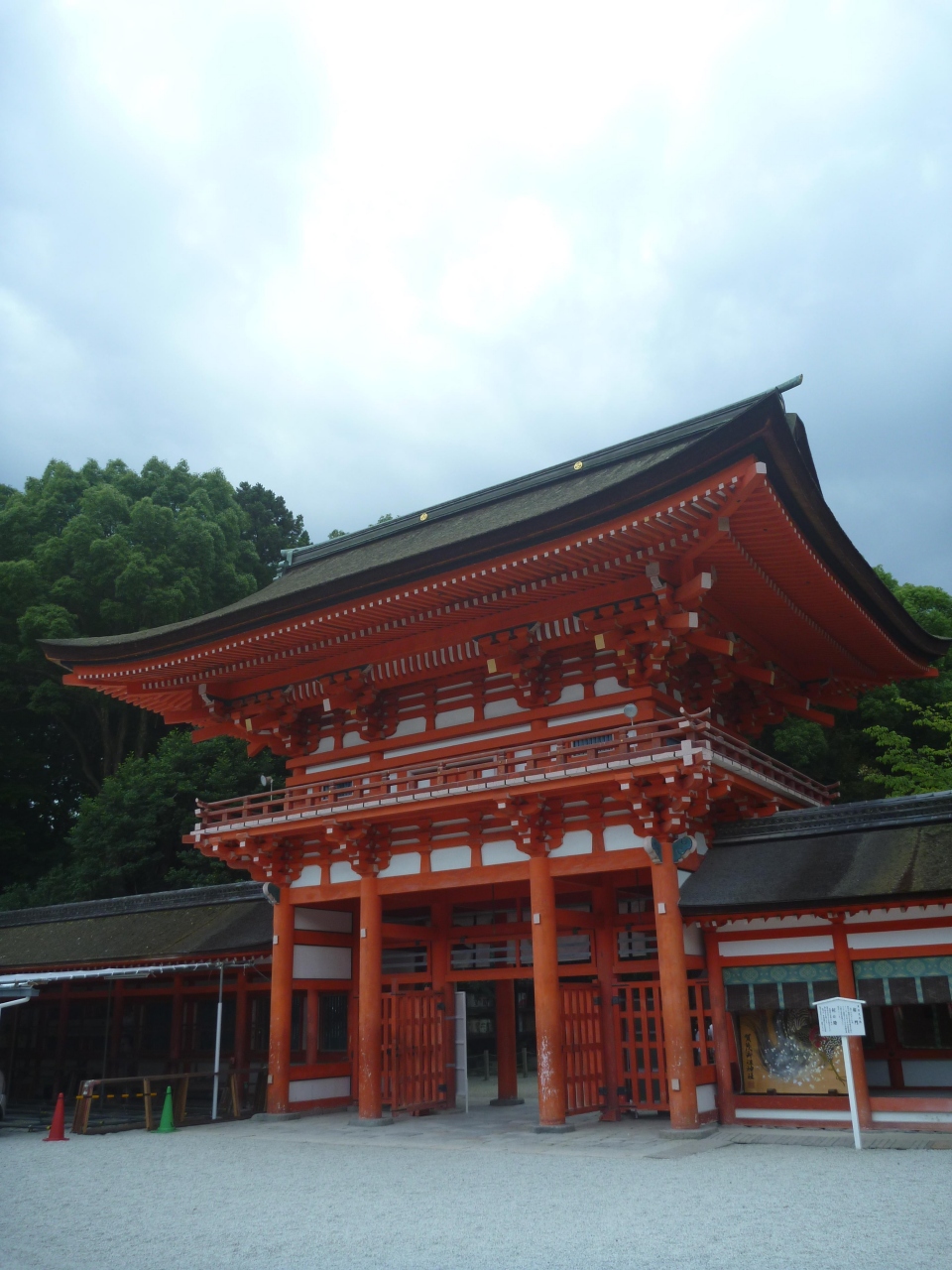 糺の森を通り抜け、けっこう歩いたな、と思った先に見えました。赤が周囲から浮き上がって見えてすごく映えます。まわりに大きな建物がないせいかとても大きく立派に見えました。神域にきた、という気持ちを高めてくれる素晴らしい楼門です。