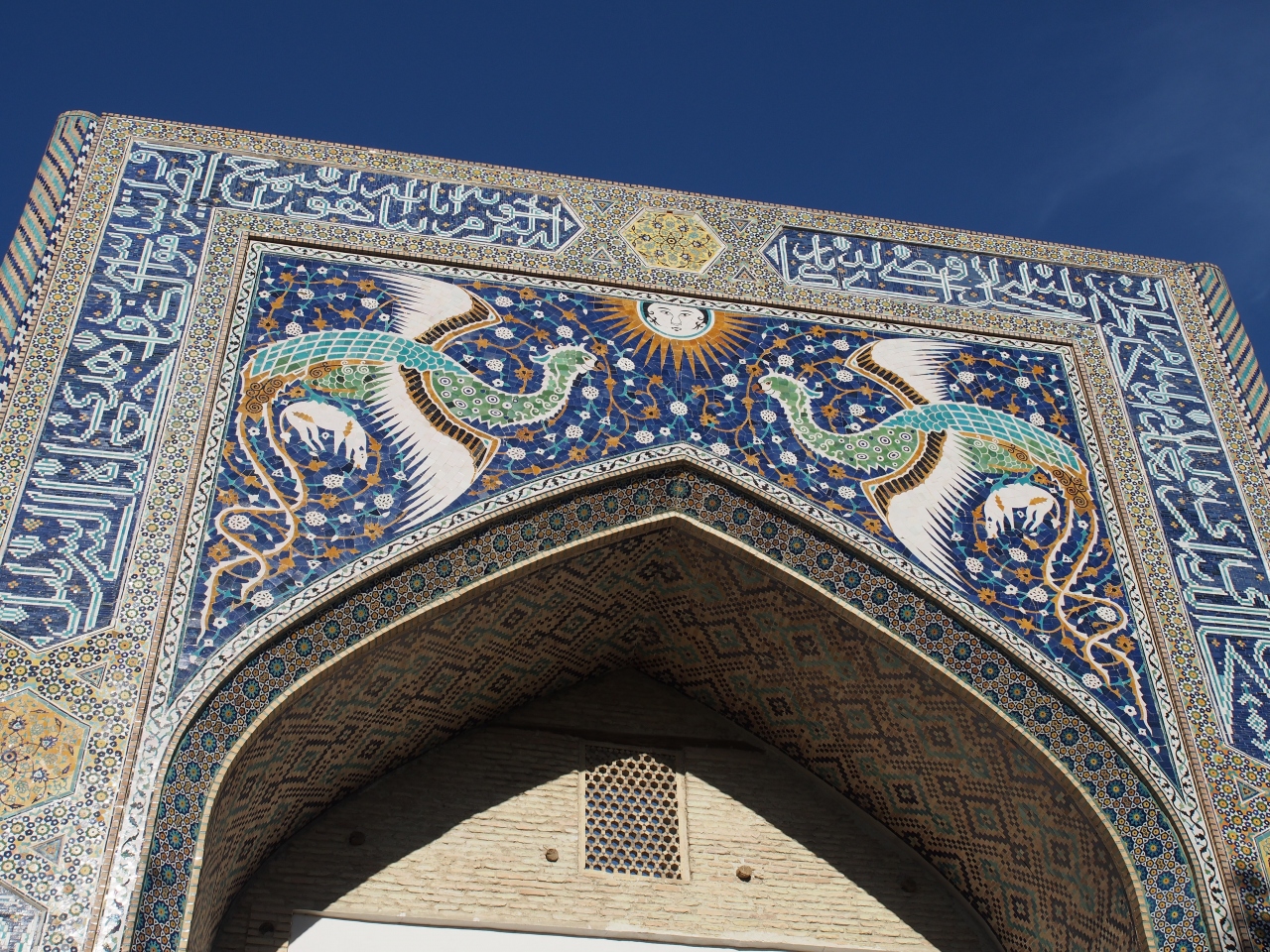 ラビハウズに面して建つメドレセです。内部は他のウズベキスタン観光地のメドレセ同様に土産物屋と土産物工房になっていますが、このメドレセの面白いところはファサードにイスラム教では禁止されている偶像(人面)が堂々と掲げられているところです。タイルの青色も美しかったです。