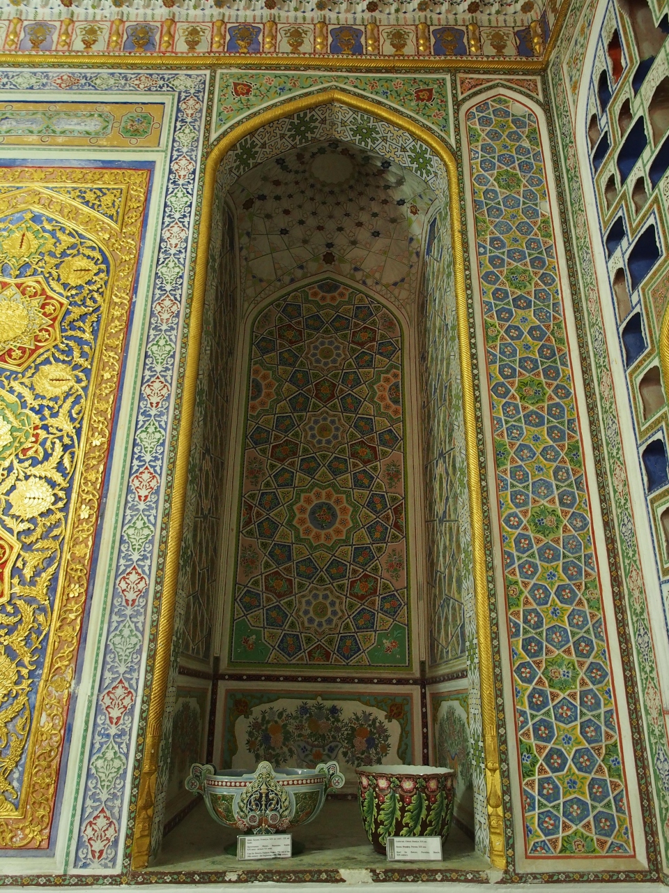 ラビハウズからはやや離れた場所にあります。バスをカラバンバザールで乗り継いでいきました。敷地内はとても広く、複数の建物があり、それぞれ、伝統的な衣装や古いスザニなどが展示されています。建物の意匠も非常に凝っていて豪華で見ごたえがありました。