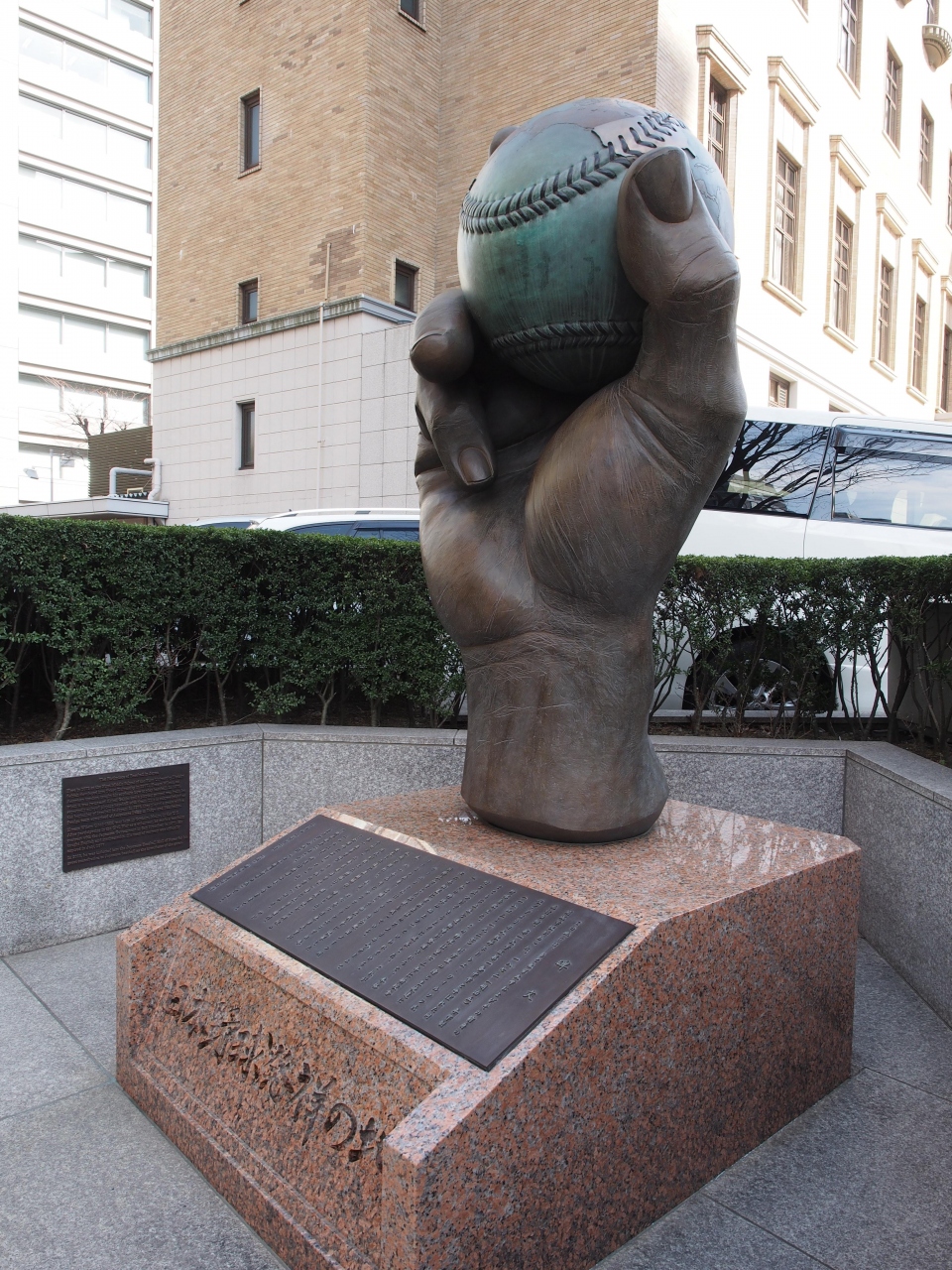 学士会館敷地内には多数の碑がありますが、その中でもこの手とボールをかたどった見た目はダントツで目立っています。