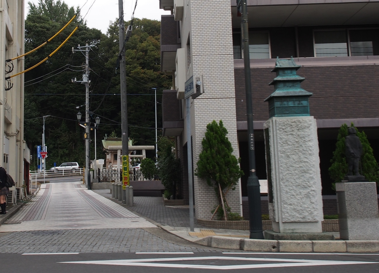 道路に小さなお城のモニュメントと人物像のようなものがあって、なんだろう?と思ったら、その奥に続く道の先に鳥居があり、この神社がありました。