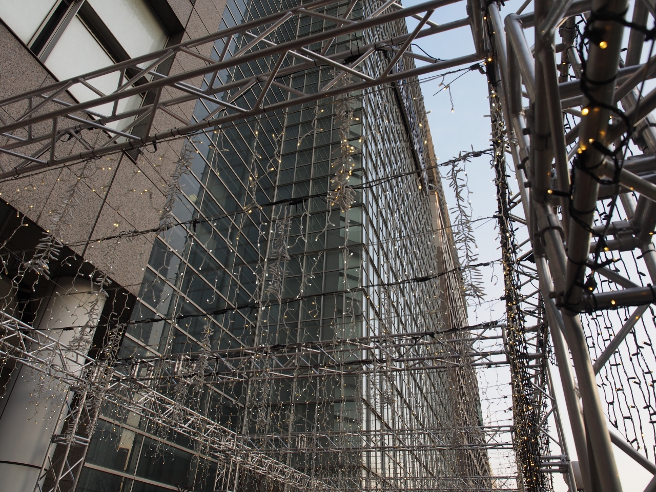 新宿駅近くのイルミネーションスポットです。目線から近いちょっと上のあたりに光の筋のようにイルミネーションの粒が垂れさがったりしていて綺麗ですが、都内の他の夜景スポットに比べるとかなりこじんまりした印象です。